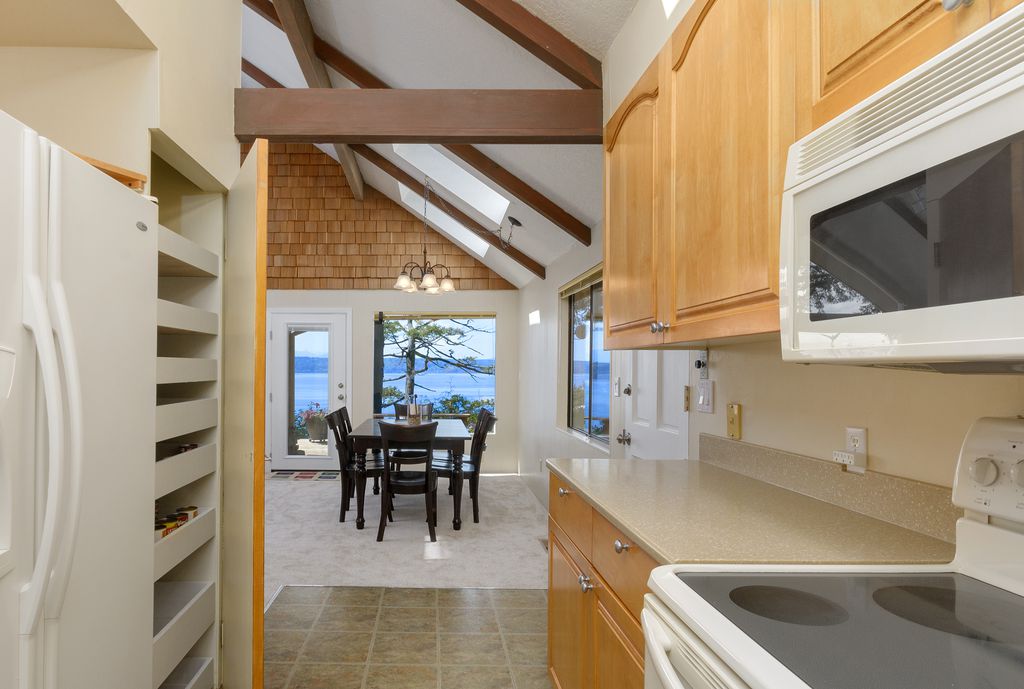 17 windows & 4 skylights flood this modern 900 sq ft space with light & offer stunning views of majestic pines framing the water. Enjoy a 2 min walk to beach & 10 min walk to Battle Point Park. Relax in indoor sauna, enjoy oversized rain shower with hand wand. Bathroom inc double vanity & radiant floor heating. Enjoy cooking/entertaining in a fully equipped kitchen with large island bar, Chef's gas cooktop, double oven & full sized fridge/freezer. Pack light! Equipped with washer/dryer.