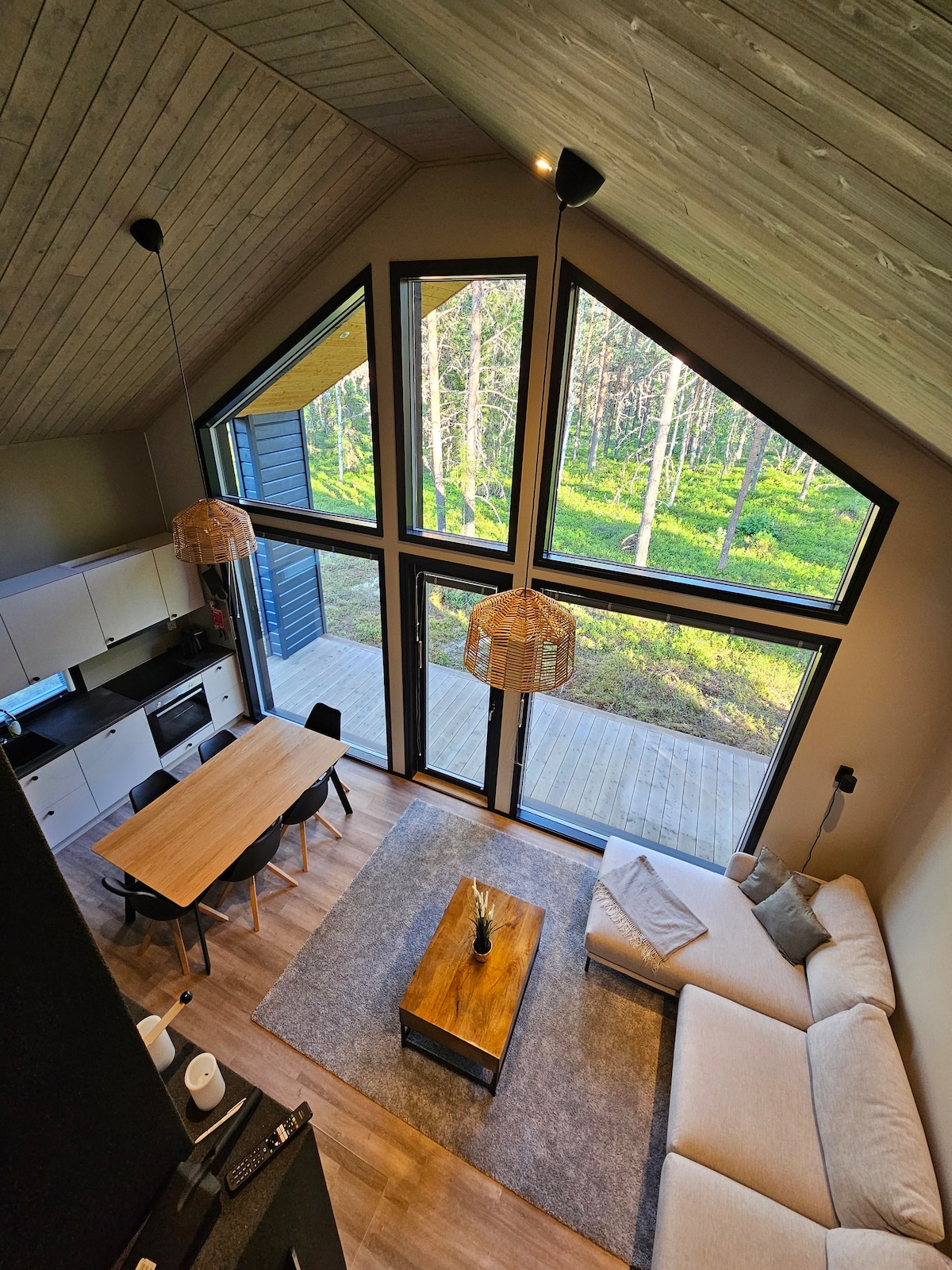 Levin Villa Repo is a modern and stylish log cabin with two bedrooms, completed in December 2023. It spans 80m² and is located in a peaceful setting, directly adjacent to forest and cross-country ski trails. The villa's large windows offer stunning panoramic views of the enchanting nature and forest landscapes. The villa includes a carport and ample parking space in close proximity. Additionally, there is a shared grill hut in the villa village. Free Wi-Fi is available.