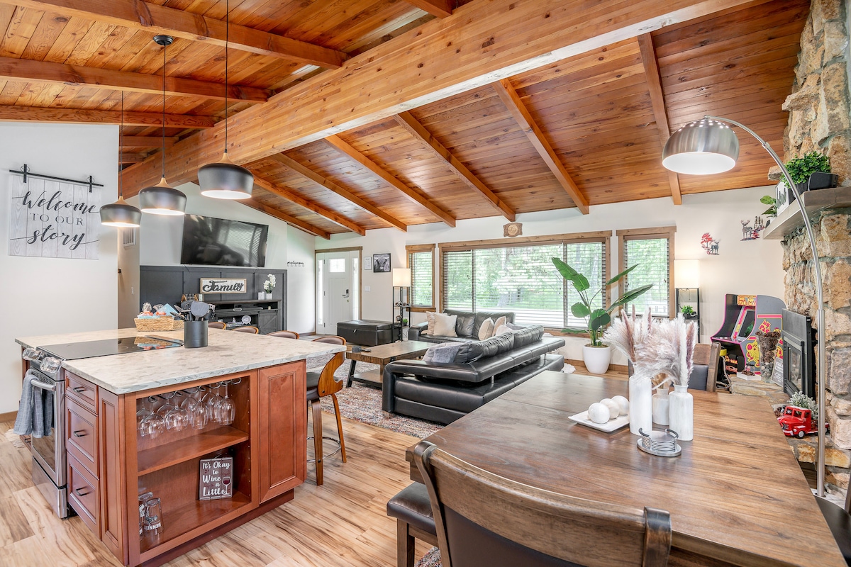 Everyone that enters the cabin absolutely loves it! Cozy & clean, great room concept. Be part of the group as you prepare your meals in the kitchen & large island with beautiful quartz. Kitchen is completely equipped, including coffee, teas, simple items like foil, baggies etc. No expense was spared when building this very cute cabin. Barn doors cover the 2 bedrooms, the bathrooms have sliding pocket doors. Stackable washer/dryer & heated tile floors in both bathrooms. We hope you enjoy it