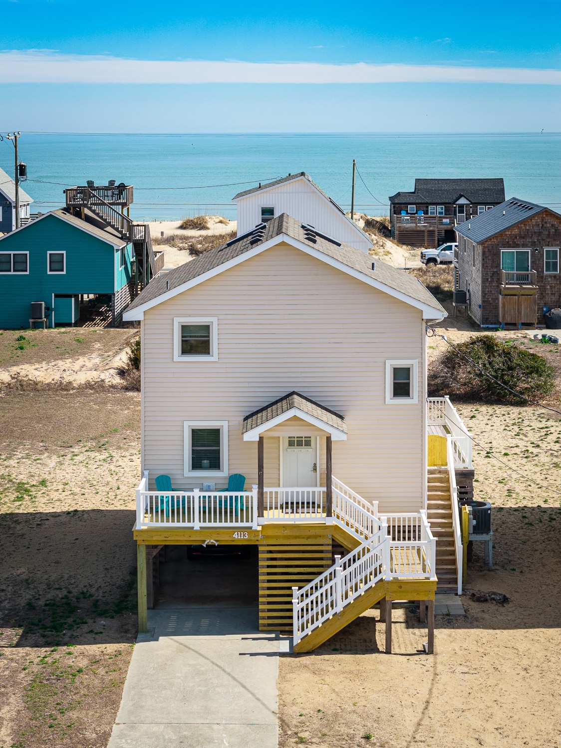 Beach Therapy is a bright and comfy cottage located just two streets back from the beach in Kitty Hawk. ✔ 2min Walk to the Beach ✔ Ocean Views ✔ Private Hot Tub ✔ Fireplace ✔ Sleeps up to 6 - 3 BR/2 BA ✔ Smart TVs in Living Area and all Bedrooms ✔ Outdoor Shower ✔ Walk or Bike to nearby Restaurants and Bars → 5min drive to Avalon Fishing Pier → 7min drive to Wright Brothers National Monument → 15min drive to Jockey's Ridge State Park and Duck