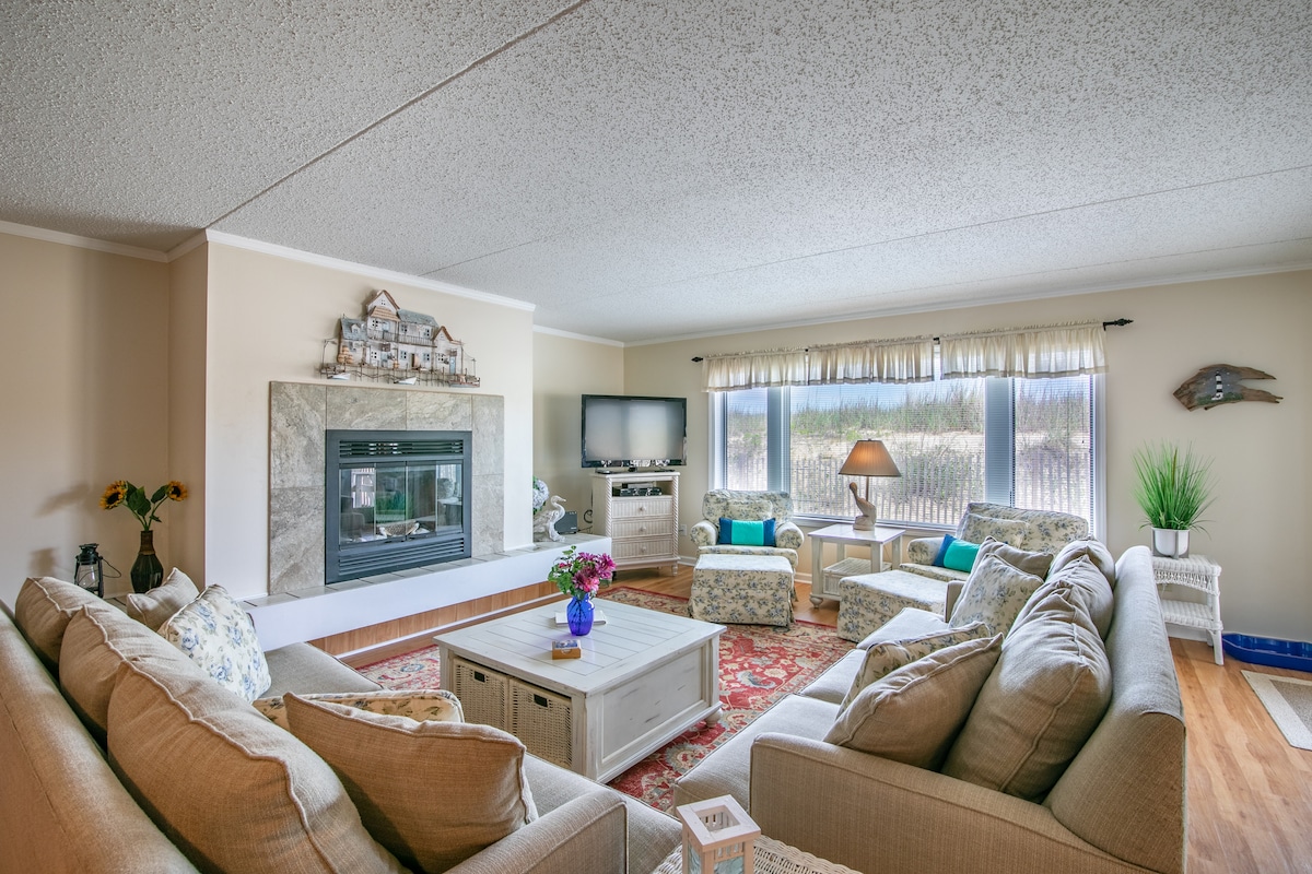 Come enjoy everything the Outer Banks has to offer. Our spacious high end condo has all of the comforts of home, and accommodates 6 adults or perfect for families. 2 Bedrooms have a King bed, 1 bedroom has a Queen and Twin bed. Each bedroom has a 58” flatscreen TV and a 65” flatscreen TV in the living room. An Oceanside bar, brewery, Mama Kwans and the Kill Devil Grill are within walking distance. There is plenty to do for the whole family. Come have a relaxing and fun vacation at the beach!!