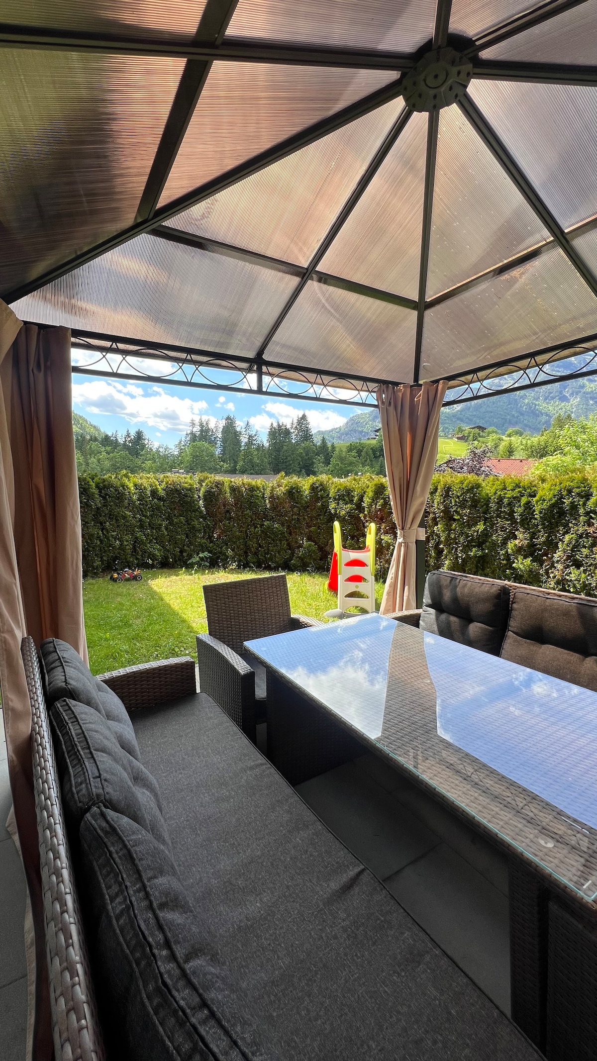 Our family-run organic farm is situated 985 m above sea level with a beautiful view on the alps. We are surrounded by skiing areas: Zell am See-Schmittenhöhe, Kaprun-Kitzsteinhorn, Kitzbühel, Saalbach-Hinterglemm and Leogang. In addition, the Krimml Waterfalls and the Grossglockner High Alpine Road are close. The apartment is situated on the bottom floor of the farmhouse. It has its own entrance and a cosy sheltered patio with a great view that is situated directly next to a big garden.