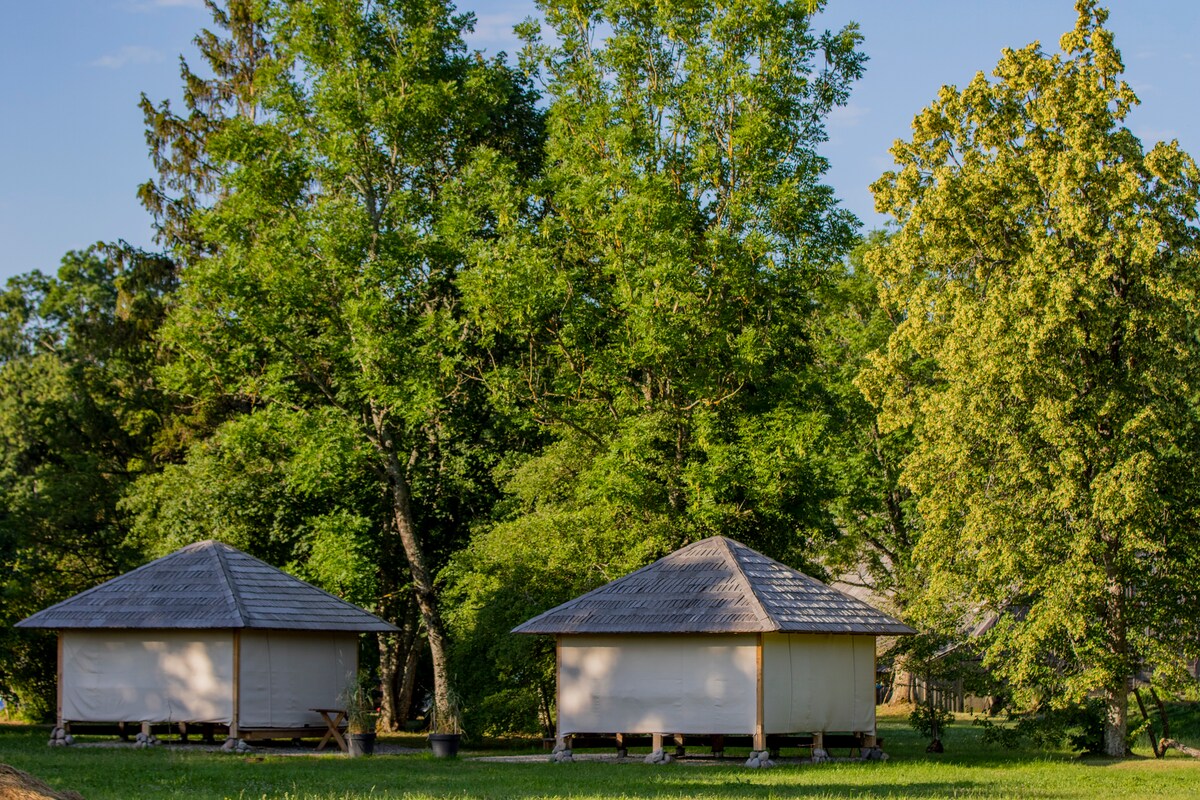 South Garden Gazebo is a unique opportunity to live like in Bali island. We offer to experience Lithuanian summer in Asian style. In Gazebo, you get to enjoy sleeping in fresh air while feeling comfortable. Gazebos are located in spacious camping that is arranged in harmony with nature. The camping guest number is limited, so there will always be enough space for outdoor activities or just relaxing. There are a few common spaces like showers, bathrooms, a kitchen, outdoor fireplace.