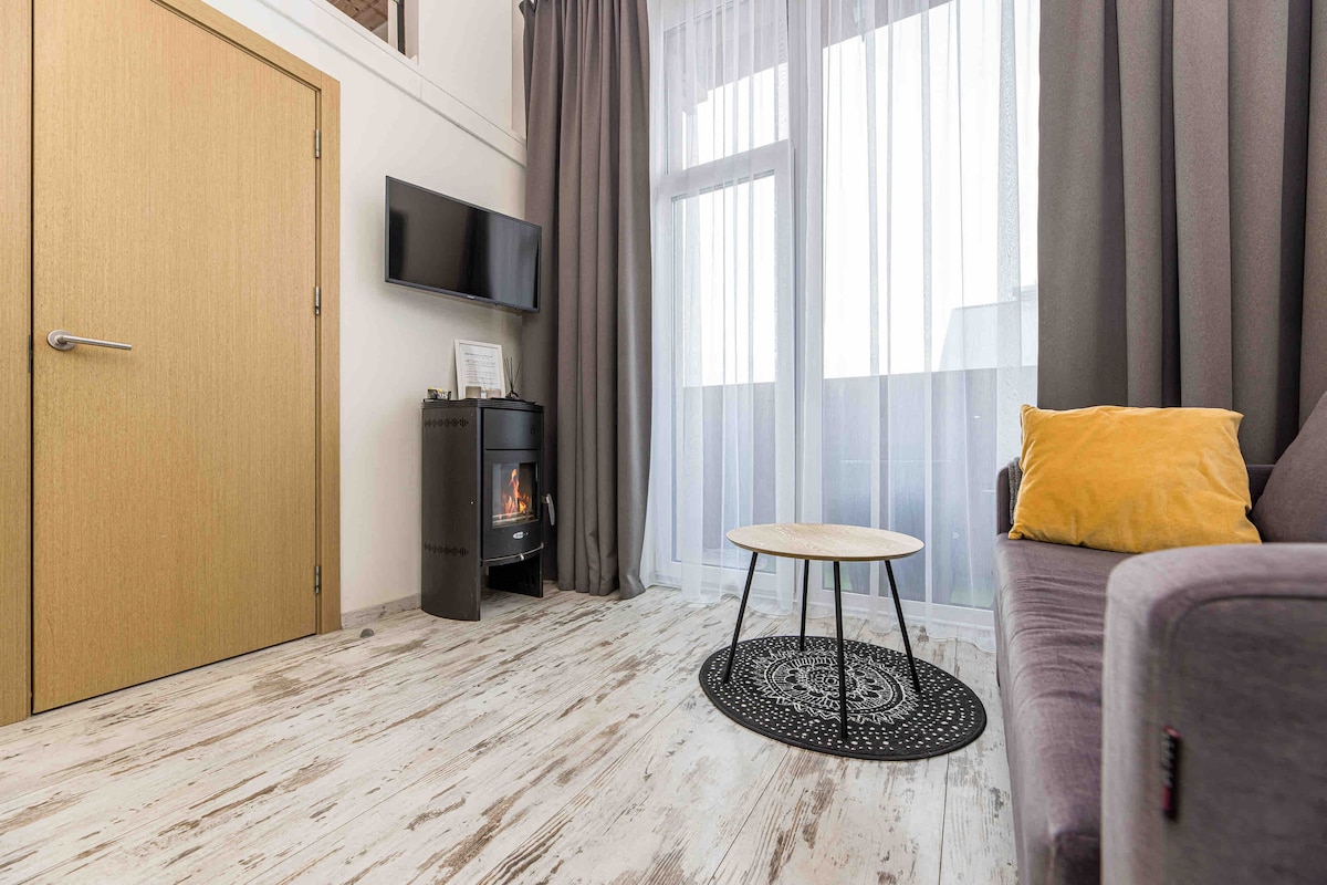 Labai jaukus, unikalaus bei išskirtinio dizaino lofto tipo apartamentai su nuosava terasa ir panoraminiu vaizdu į gamtą. 600 m. iki jūros - tai puiki vieta poroms, šeimoms, ieškančioms privatumo ir ryšio su gamta. Tai vieta, kurioje miesto pulsas susilieja su ramybe ir svečiams suteikia išskirtinį poilsio kokybės pojūtį. Dideli panoraminiai langai leidžia grožėtis gamta net būnant namuose, terasoje malonu atsipalaiduoti, mėgautis ramybe ir tyru pajūrio oru.
