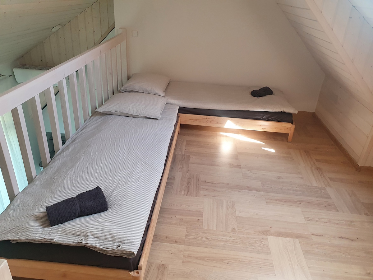 In the apartment on the first floor you will find a living room with a kitchen and a balcony, where you can enjoy your morning coffee. The kitchen is equipped with all the necessary tools and equipment for cooking. There is also a bright and cozy room with a double bed, which will ensure the quality of your rest and sleep. On the second floor, you will find a comfortable double bed, as well as a pull-out sofa bed and a cozy reading corner.