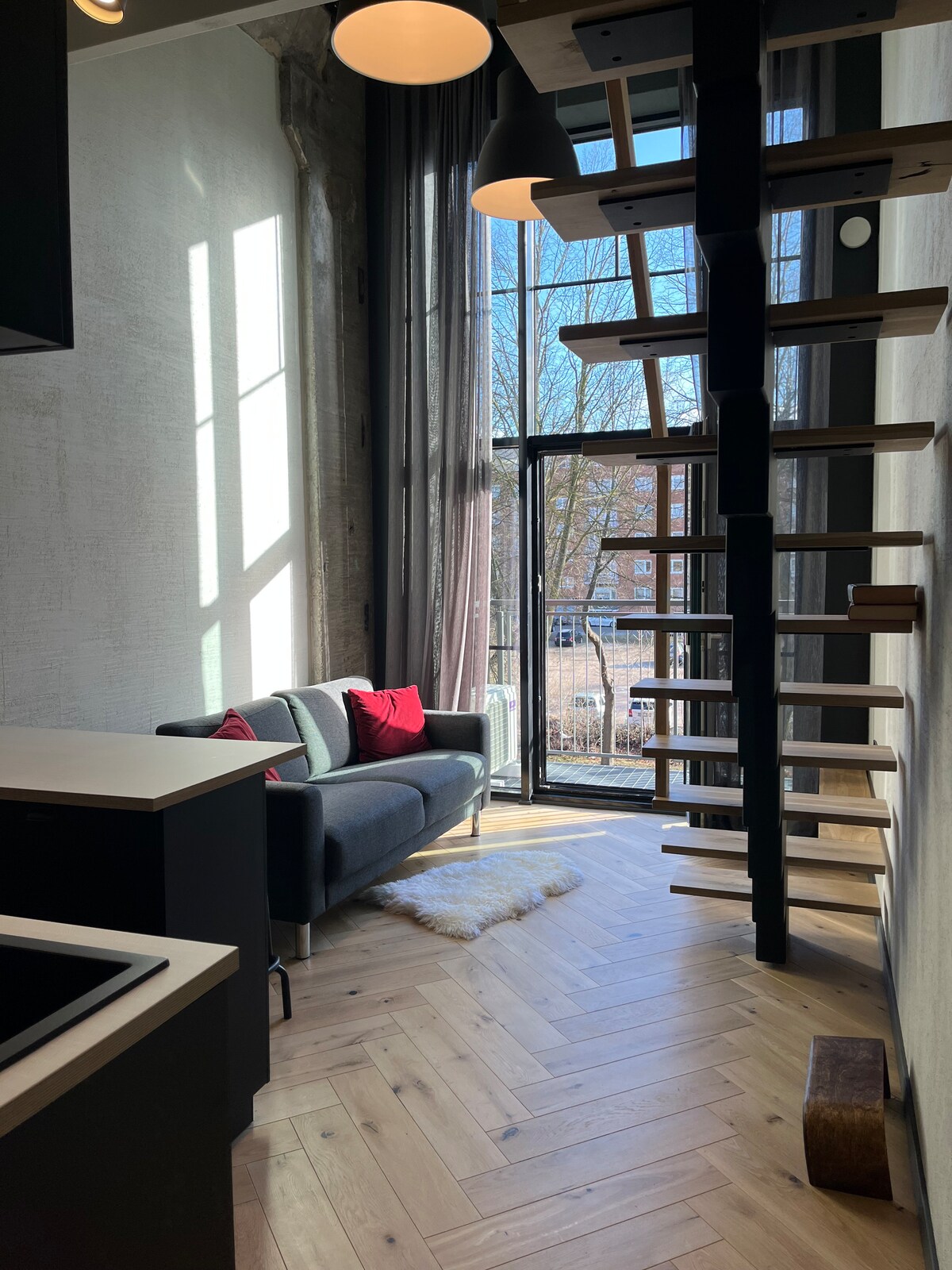 We are offering Loft apartment with 4meter windows and almost 5meter ceilings. It has industrial but yet luxurious vibe to it. With brand new full kitchen, king size bed it will be comfortable to spend your time in Klaipeda. Also it is located next to the old town so it is perfect for people who like to reach most beautiful places in the city fast.