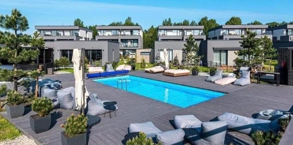 Tai puiki vieta vertinantiems privatumą ir ramybę be papildomo miesto šurmulio. Atostogaudami čia, Baltijos kopas bei jūrą pasieksite pėsčiomis (apie 1 km.). Kvartale galėsite naudotis šildomu baseinu Jums patogiu metu, o mažieji atostogautojai galės šėlti vaikų žaidimo aikštelėje. Norintiems aktyvaus poilsio, netoliese rasite jėgos aitvarų bazę. Kotedžas yra dviejų aukštų (47 kv.m.)
