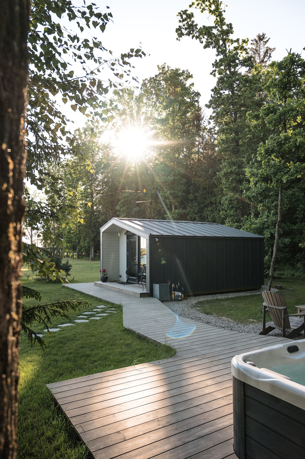 This is an unique space to rest in forest, away from the city lights and people. Tiny house (16sq. meter) is located in a private area, 60 meters from the small lake which is known for its extremely beautiful colored water. Private forest is five steps away from the terrace. Outside hot tub with the view to the forest is a magnificent experience. House and outside area is fully equipped for a convenient and relaxing stay.