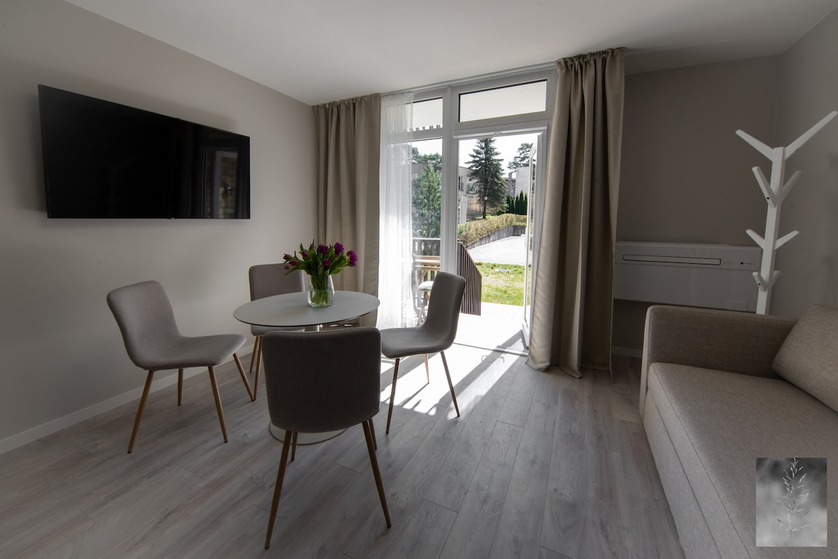 A stylish and newly furnished apartment with balcony in the heart of Juodkrante and a minute walk from the forest. It features a comfortable Queen bed, sofa-bed, TV, kitchen, a desk for dinning as well as a shower. The building is surrounded by nature, there is a 1.1 km forest path to the sea and a 2 min. walk to the lagoon. You may enjoy the silence and lagoon view from your balcony. You will receive a key code to enter the building as well as your room.