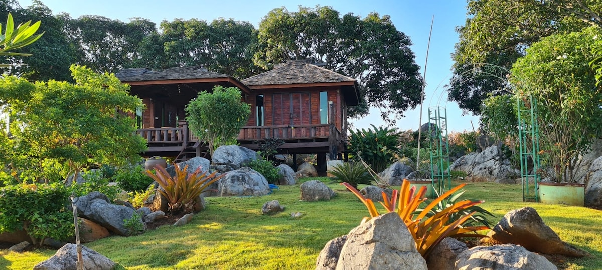 Kick back and relax in this calm, stylish space. A cozy A-frame cabin nestled on the hill of a small mountain. You will enjoy panoramic view of Khaoyai mountain which is less than 30 minutes drive. Restaurants, shops, and attractions are minutes away Free breakfast can be enjoyed anywhere; in the garden or on a deck overlooks the mountain. The fire-pit is steps away from your door. You can enjoy seating and strolling in the garden. The property manager will be around in case you need anything