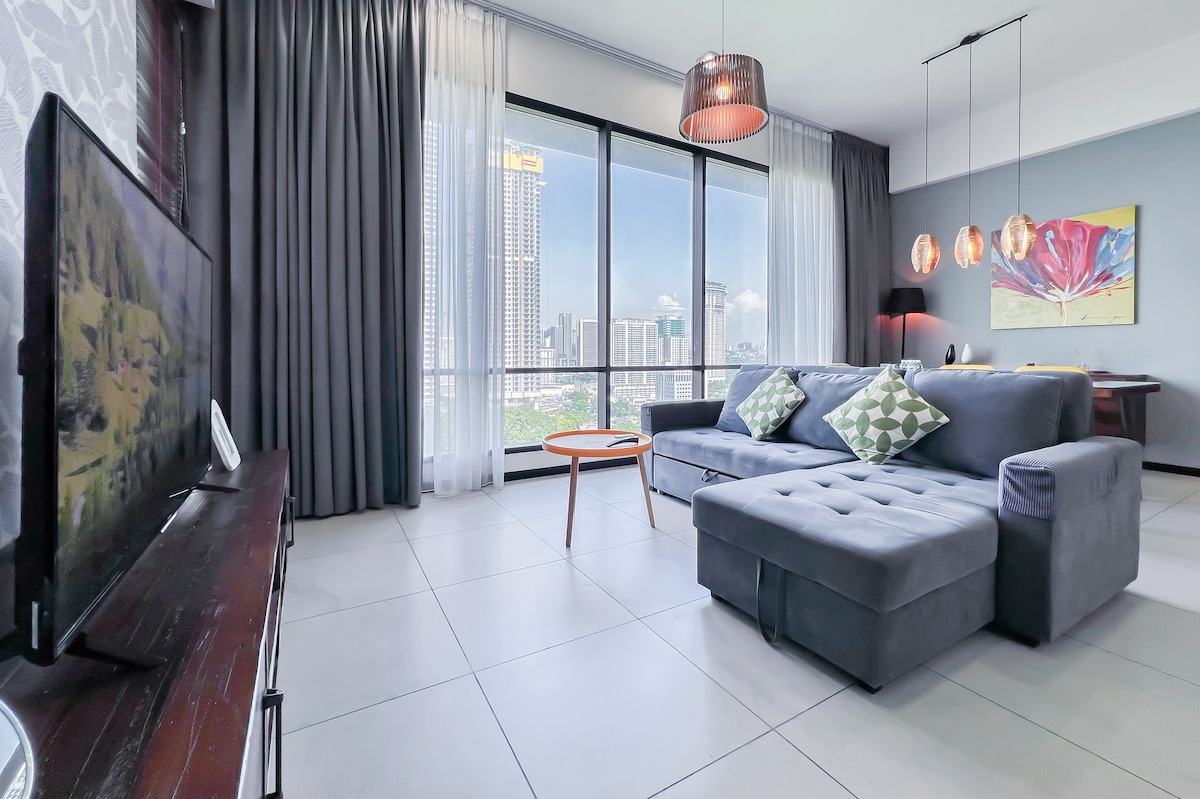 Sit back and relax in this calm, stylish space. Why Seashell suite at Lucentia Residence - Best views of KL - Beautifully decorated with a fun spirit - Centrally located & attached to public transit hub - Fast wifi - 2 TVs with Netflix & others - 2 gorgeous pools - Family friendly with baby crib & highchair - Gym, pool table, BBQ pits, piano - Garage parking - Recommended to Sleeps 6, max 8 person - LaLaPort Shopping Mall & the WOW entertainment street are attached - Grocery, drug store & Cinema