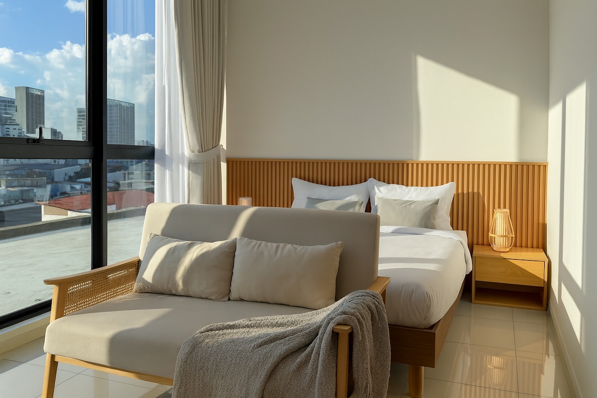 Enjoy this studio apartment decorated with neutral tones and woody accents, inspired by the Japanese Muji minimalist aesthetic. Perfect relaxing getaway for families and groups. Located in Desa Sri Hartamas, guests will be able to enjoy cafés and restaurants within walking distance. The apartment building is equipped with amenities including swimming pool, gym, children's play area, lounges and co-working spaces.