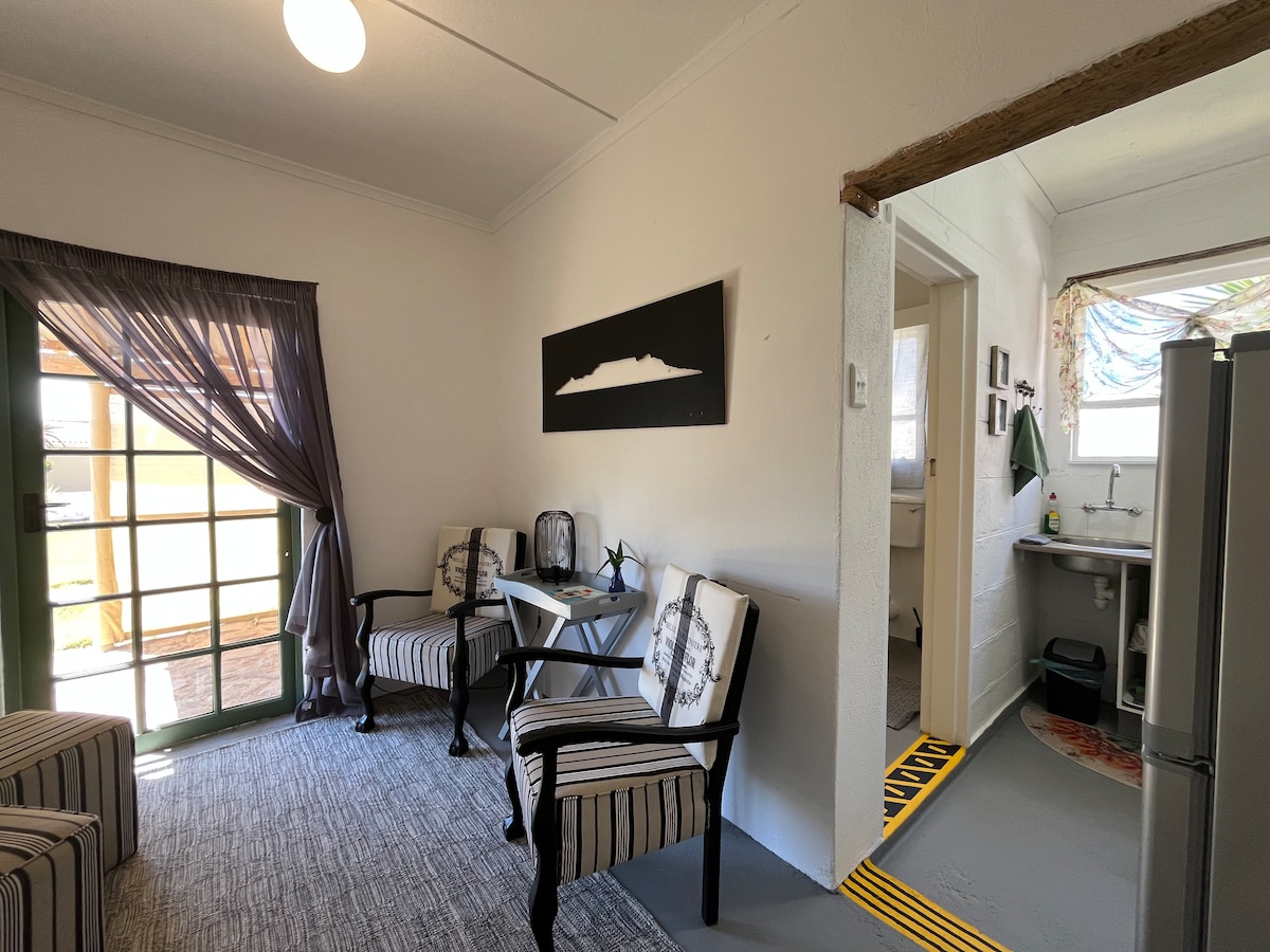 NO PETS. NO PARTIES, LOUD MUSIC, ALCOHOL ABUSE OR UNPAID GUESTS. Self-catering unit with two rooms. Each room has a double and a single bed. Well equipped spacious kitchen with 2-plate induction cooker, fridge/freezer, microwave, kettle, toaster and cutlery. Bathroom with bath and shower. Linen and towels included. TV - DStv Easyview. Braai facilities and free Wi-Fi included. Daily service available on request (extra fee). Safe parking in front of the unit