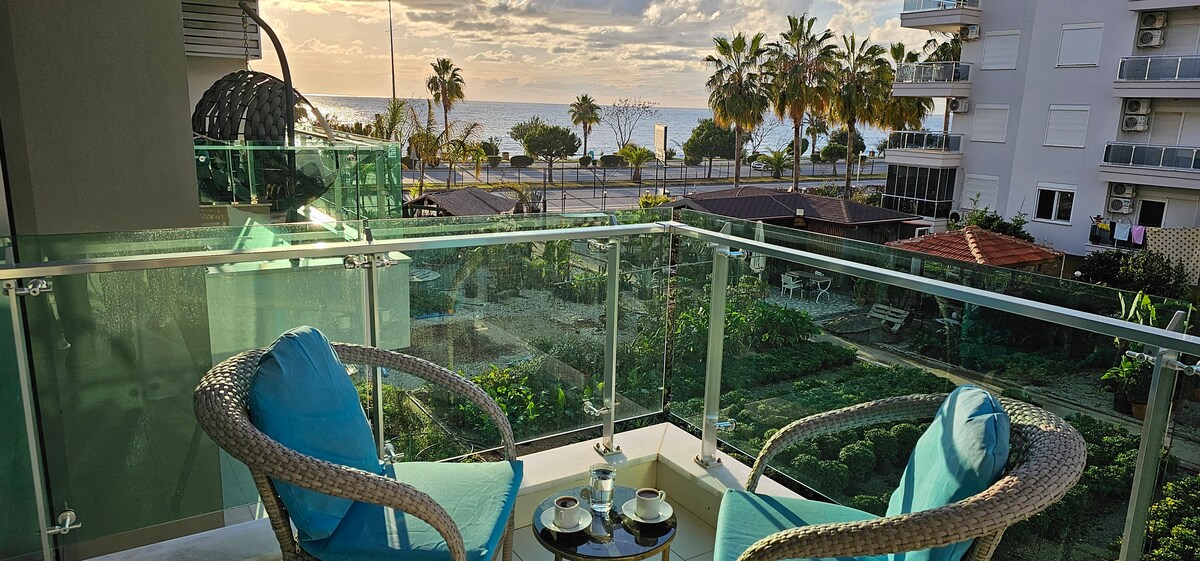 "Officially Licensed for short-term rental" Welcome to the Beach Haven, your relaxing vacation getaway place. This luxurious sea-view apartment lives directly on the coastline of Alanya -Outdoor pool ✔ -Indoor heated pool ✔ -Kids area ✔ -Garden ✔ -Turkish Hammam and Sauna ✔ -Gym ✔ -Private tunnel Beach access with sunbeds and umbrellas ✔ -TV, WIFI ✔ -24 hours security ✔ -Zero meters to the beach ✔ -Sea and mountain views ✔