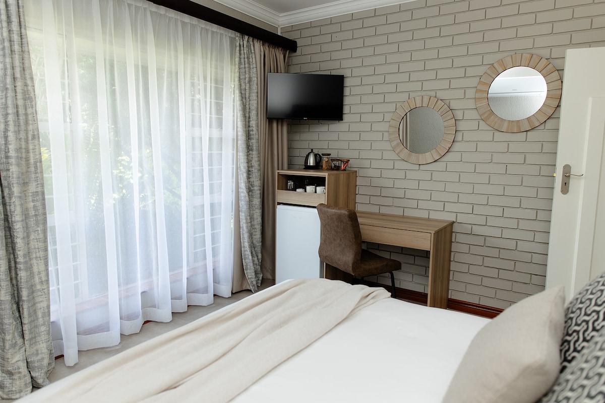 Beautiful room nestled in the heart of Wilkoppies with Garden View Relax in this warm and inviting en-suite room featuring a comfortable king-size bed and a shower-only bathroom. The room includes air-conditioning, WiFi, a smart TV, and coffee/tea facilities for a convenient stay. Guests also enjoy a fridge and microwave, perfect for light self-catering. Large windows with sheer curtains bring in soft natural light and overlook a peaceful outdoor area. Perfect for business or leisure stays.
