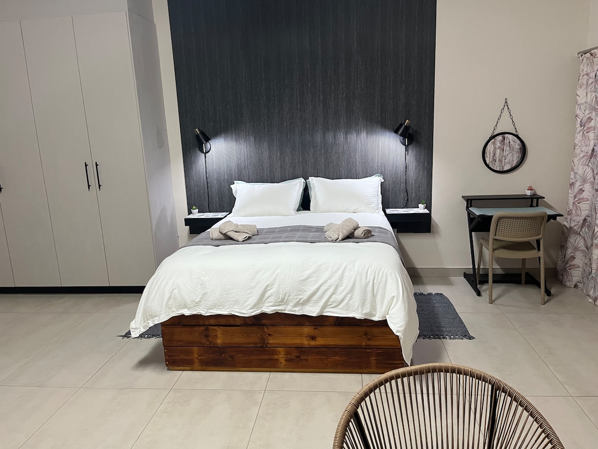 Marmers’ place is a tranquil self catering apartment , with modern finishes, which will make you feel right at home. Ideally situated from hospitals , restaurants, and shopping centers (300 meters from Wilmed park hospital). The apartment has DSTV, WiFi, a open plan living room and kitchen, a separate bedroom and an en-suite bathroom. This is a family friendly area, with secure under roof parking and easy access via remote control gate. Perfect for long-term stay or a one-night stay.