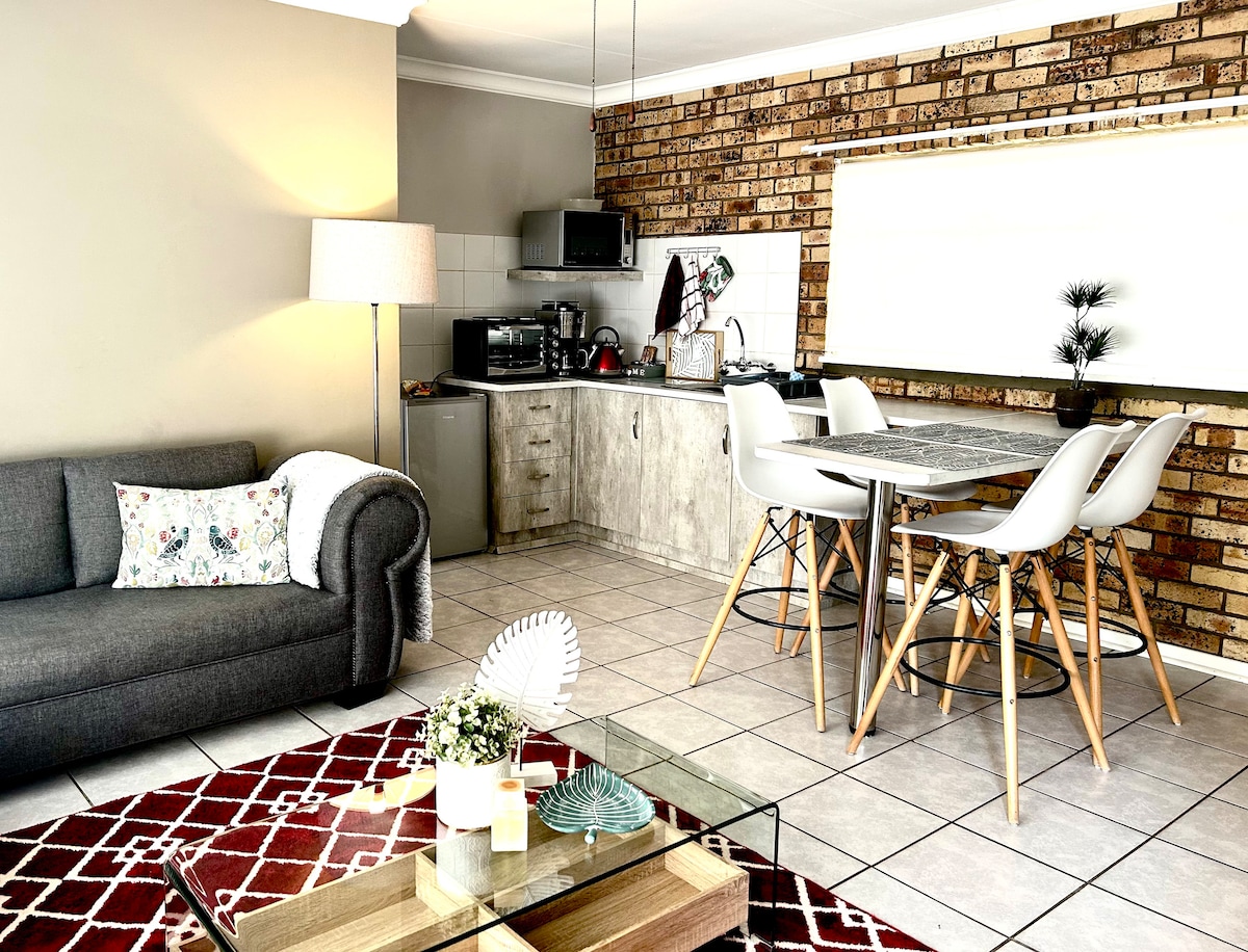 A cozy thatched bachelor room with vintage decorations. Everything you need in a tiny space. A comfortable chair to sit and read. Enough working space at the table. You are welcome to enjoy the garden. 3 Hospitals nearby: Anncron - 1.5km Sunningdale - 1.6km Wilmed - 3.6km Tsepong - 7km air fryer and microwave