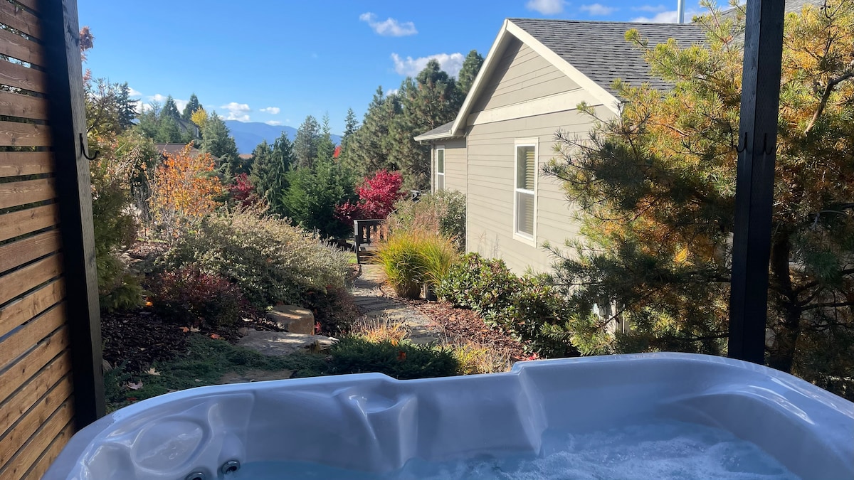 Deluxe Suite overlooking White Salmon & Columbia River, less than a mile from Hood River. Surrounded by Gorge beauty and hiking trails. Includes: Hot tub; fireplace; private parking & entrance; stocked gourmet kitchen, bathroom w/ shower, queen-sized pedestal bed, recliner couch, & floor mattress. Suite has WiFI, Flatscreen TV, AppleTV, BluRayDVD, & Apple HomePod. Guests also have access to the home's terraced gardens, koi pond, fire pit area, outdoor dining areas, hot tub & in-home gym.