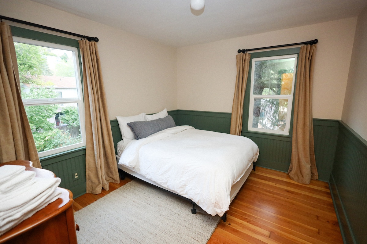 This King Suite is perfect for a family getaway or a group of friends with extra beds and ample space. In addition to the king bed, there is a set of custom-crafted, twin-size bunk beds. You'll love the natural light, ample space, and all the standard amenities, including an ensuite bathroom with a shower and a kitchenette. The Inn of the White Salmon is quiet, pristine, and centrally located to all of the Gorge's attractions. You'll also have access to the shared gardens and common room.