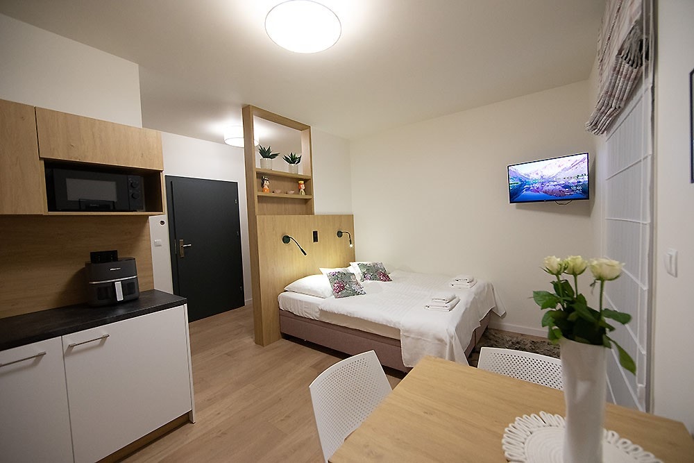Zapraszamy Cię do naszego mieszkania. Znajdziesz w nim wygodne miejsce do spania dla 6 osób. Apartament składa się z 2 sypialni, w których są po dwa pojedyncze łóżka (dla Twojej wygody zadbaliśmy abyś mógł połączyć je w duże łóżka, sam zadecyduj czego potrzebujesz). W salonie znajduje się duża rozkładana dwuosobowa sofa i płaski TV. Mieszkanie ma w pełni wyposażoną kuchnię (zmywarka, ekspres, mikrofala, lodówka, piekarnik) oraz łazienkę z prysznicem i podgrzewaną podłogą.