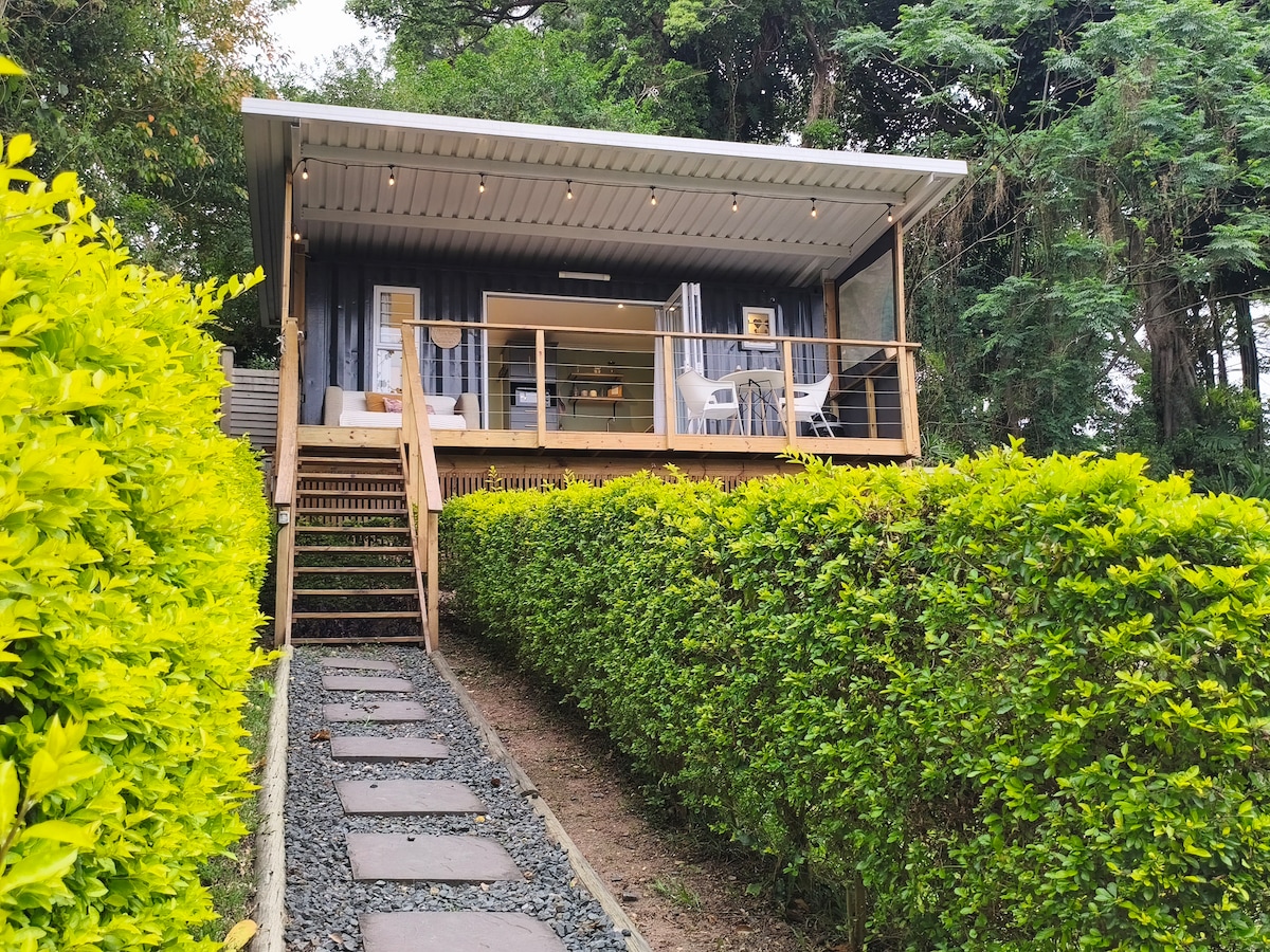 Come and experience the cute little 20ft shipping container that has been turned into a cozy stay for a single or couples. The functional kitchen with all the basic necessities will be all you need to create a romantic dinner, or even just a coffee for yourself - both of which can be enjoyed with a tree-top view from the deck. The shower is surprisingly spacious and the gas geyser ensures hot water always. This space aims to delight and invoke a sense of serenity as you focus on the basics.