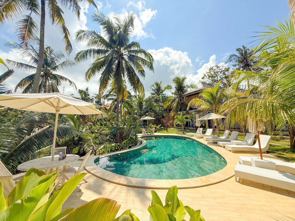Stay in the heart of Nusa Penida, secluded within Bali's bird conservation, with flocks of birds singing over you! & surrounded by 100-year-old trees! Enjoy your stay in a unique-charming room with a pool, & outdoor-indoor shower! Only 200m from Nusa Penida's most famous area of restaurants, bars, and beach clubs & dive centers! Only a few walking distances to a pristine beach overlooking Mount Agung with beautiful coral scenery perfect for diving & snorkeling.