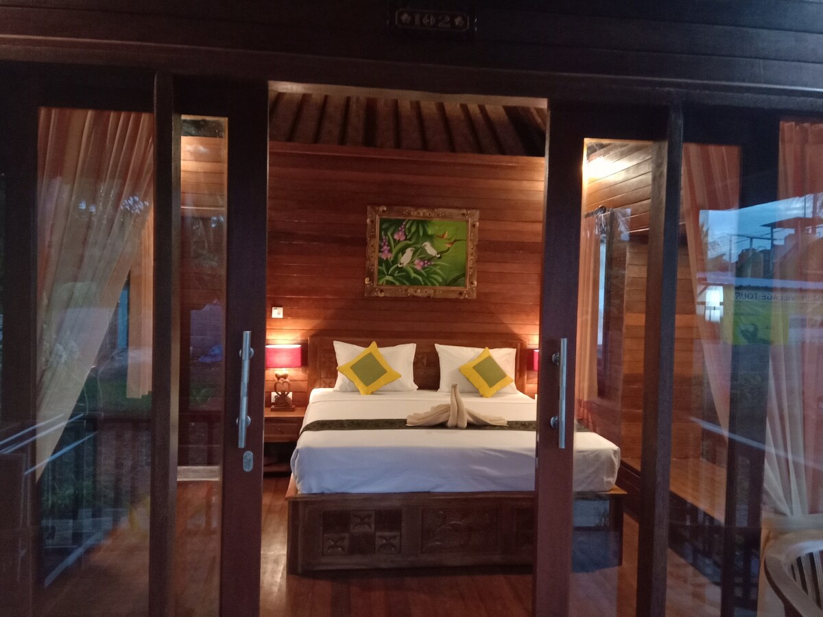 Bungalow traditionnel balinais tout en bois, décoré avec goût. La chambre de 24 m2 possède un lit 180 x 200 très confortable, un bureau et une grande armoire. La salle de bains attenante comprend une grande douche à l'italienne avec eau chaude, un WC et un grand lavabo avec miroir. Le petit déjeuner inclus, vous sera servi chaque matin, entre 8h et 11h selon vos souhaits. Vous aurez le choix parmi du pain, des pancakes vegan, des oeufs, ou un smoothie bowl, le tout fait maison.