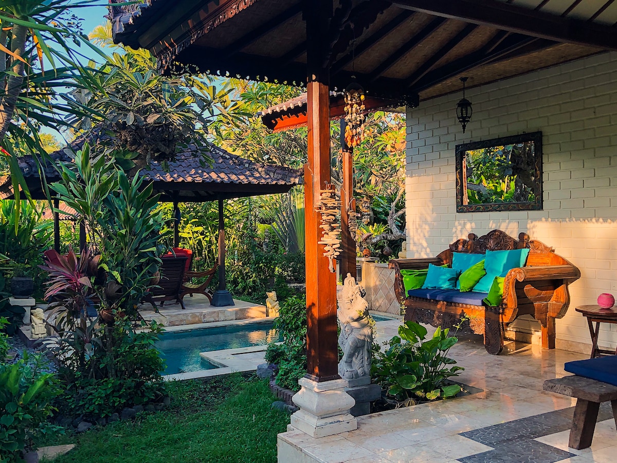 Get fully emerged in AUTHENTIC Bali with this true LOCAL experience that comes with an INCLUSIVE PACKAGE. Our Balinese CHEF Dani will take you on a FOOD journey (breakfast + dinner included) and your PRIVATE driver Ketut will pick you up for free at any location on Bali to take you to our litte paradise. For a small extra fee you can book trips with him and explore the best of Bali. Escape the hustle of the Bali crowds at this PEACEFUL getaway with PRIVATE pool and LUSH garden. Fast Wifi