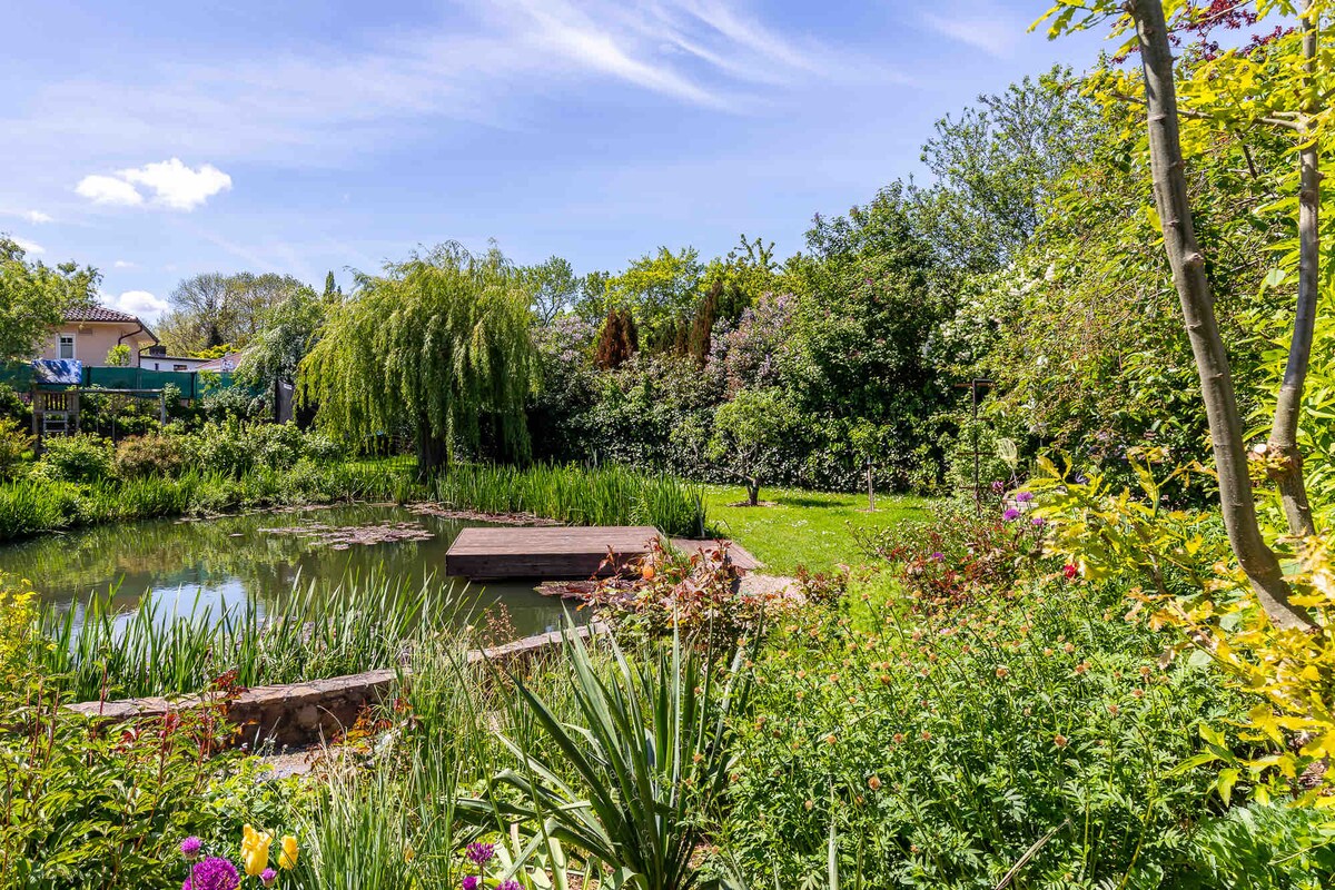 ruhiges kleines Landhaus, mit sehr exklusiver Ausstattung 1 km von der Ostsee in Warnkenhagen, in einem großen Blumen-Obst und Gemüsegarten . Vom Grundstück geht ein Weg zum Strand über Felder und durch einen kleinen verwunschenen Wald.
