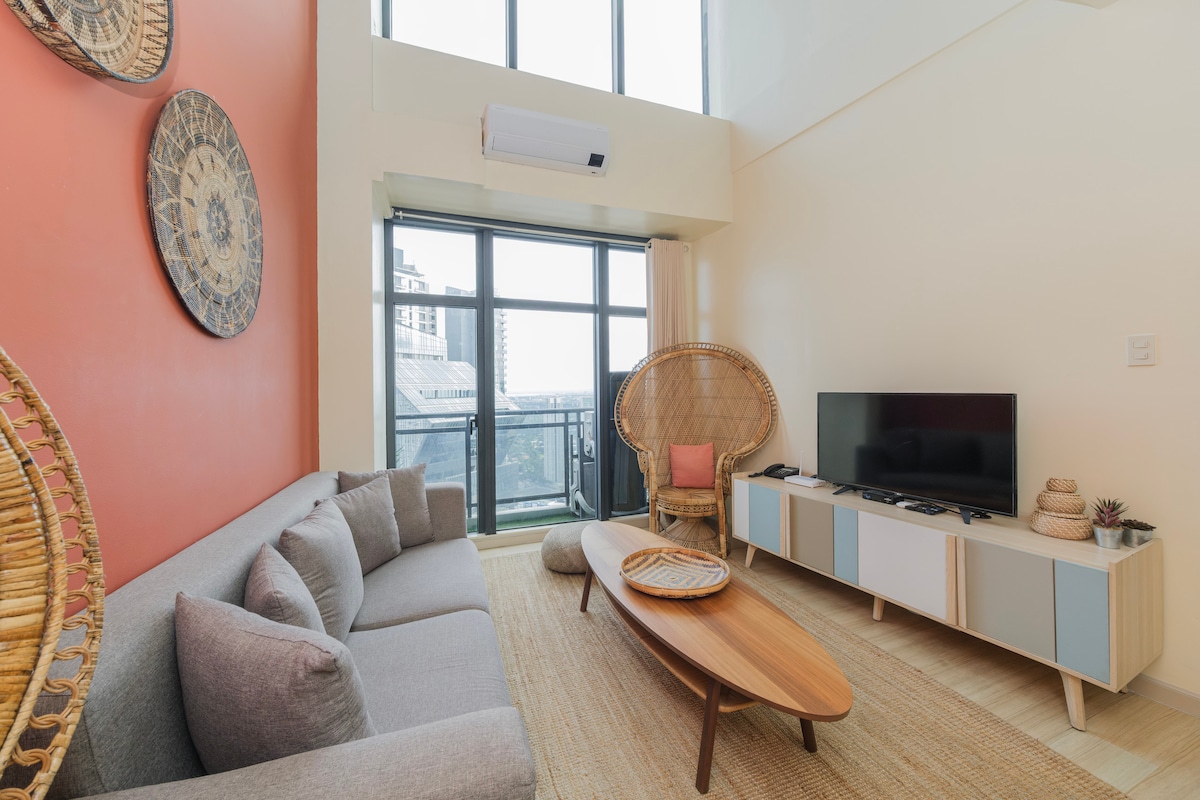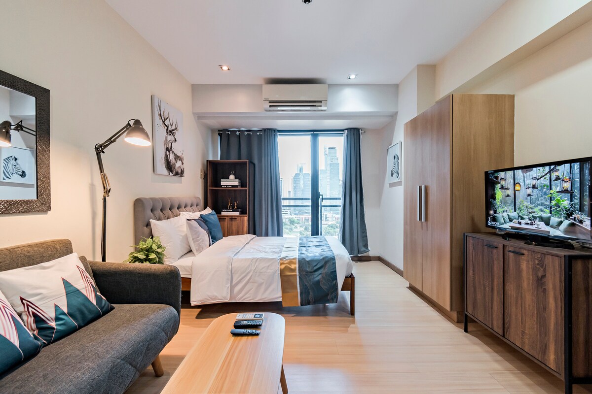 ☁️ Where sky meets the sea 🏙️ High-Floor Skyline | River View 🔆 Iconic Rockwell Lights 🔴 Send ID upon booking (weekday before arrival), else cannot check-in. ☁️☁️☁️☁️☁️ A room with sky-high aural feel, soft comfy queen bed, fast WiFi, smart TV, room essentials, hotel amenities, and a 24/7 security. On top of them all—affordable. Where else will you be? ✅ PERFECT FOR DIGITAL NOMADS 300 Mbps Wifi + Relaxing Amenities to Cool Off