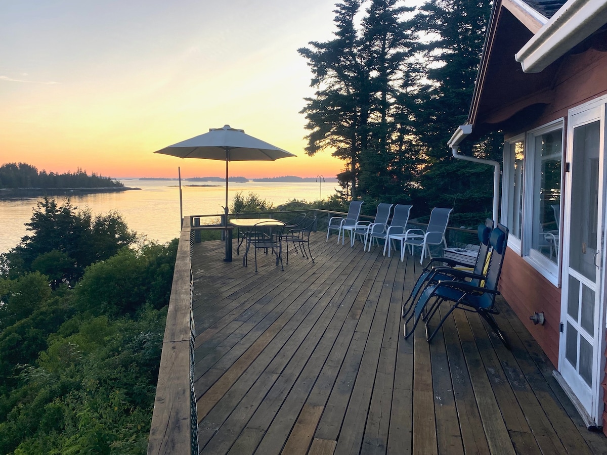 Breathtaking oceanfront private cottage. Spiral staircase to second floor bedroom. Sliding glass doors open to wrap-around deck and lawn that slopes to Ocean. 300 + feet of deep water frontage. Separated from lawn by broad rock ledge. Perfect spot for sunbathing or having a campfire in the evening. Enjoy your morning coffee watching lobster and sailboats in the Mussel Ridge Channel. Unbelievable and peaceful views out to ocean and north to the Camden Hills. Unparalleled views everywhere.