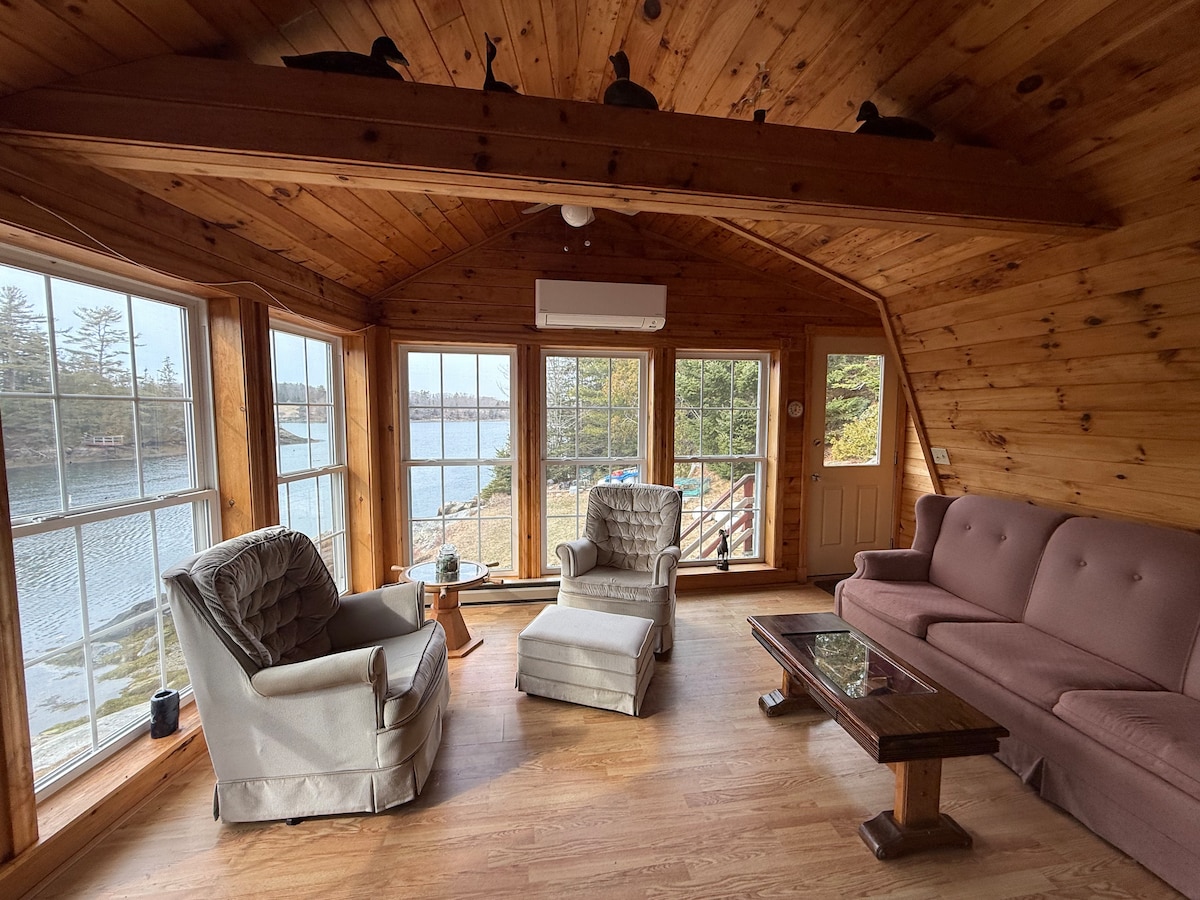 Breathtaking oceanfront private cottage. Spiral staircase to second floor bedroom. Sliding glass doors open to wrap-around deck and lawn that slopes to Ocean. 300 + feet of deep water frontage. Separated from lawn by broad rock ledge. Perfect spot for sunbathing or having a campfire in the evening. Enjoy your morning coffee watching lobster and sailboats in the Mussel Ridge Channel. Unbelievable and peaceful views out to ocean and north to the Camden Hills. Unparalleled views everywhere.
