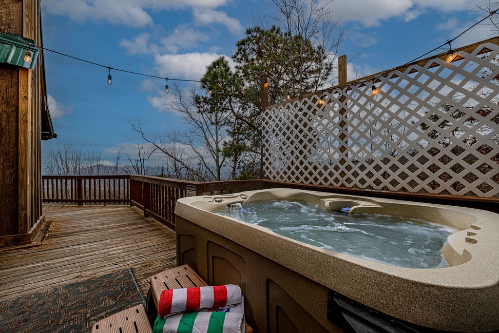 带热水浴缸和风景优美的山景的私人小屋