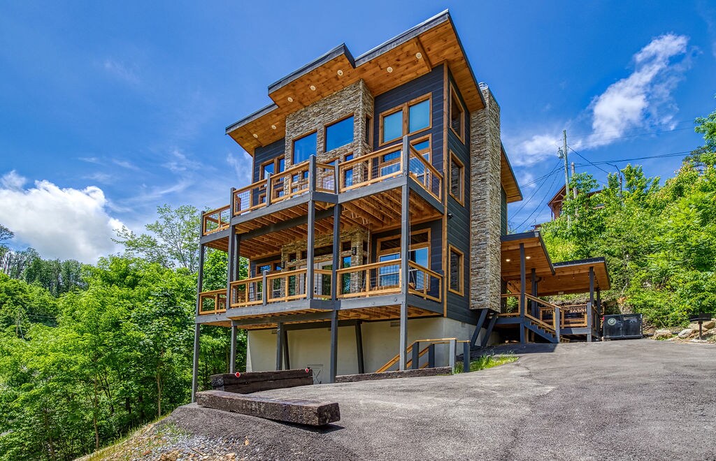 Experience unparalleled luxury at Windows to the Mountains, a modern marvel nestled in Gatlinburg with stunning views of Mt. Leconte. Chalet features a rooftop deck with a modpool, movie theater, and exquisite outdoor amenities. Enjoy a fully-equipped kitchen, cozy living room with a vapor fireplace, and a master suite with a spa-like bathroom. Complete with a coffee bar, game tables, and a sauna, Windows to the Mountains offers an exclusive retreat for discerning guests seeking a lavish escape.
