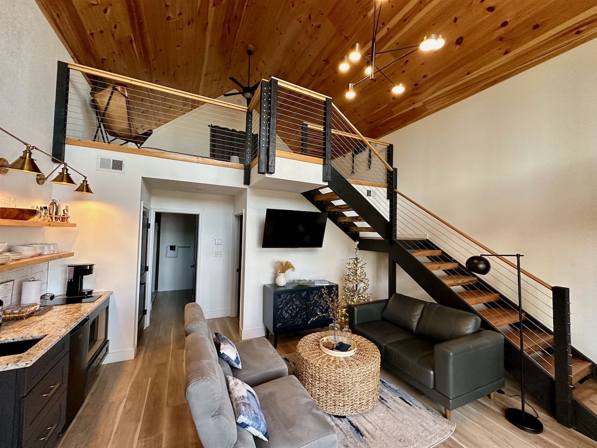 Plenty of space and privacy in this cottage over looking the fields and pond. Sit back and relax watching the horses and goats graze. Located minutes away from Oak Ridge/Clinton/Knoxville. Melton Hill lake has outdoor activities, restaurant & nice walking trail and is 10 minutes away. University of TN is 23 minutes away and Oak Ridge is 13 minutes. The 16’ ceilings make this 480 sq. ft. space feel enormous. The Kitchen has a full size refrigerator, keurig, microwave & convection oven combo.