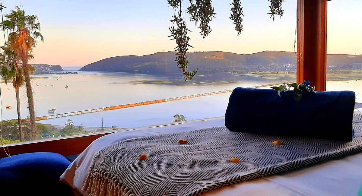 Located in the heart of Paradise, perched high above the town with breathtaking handcrafted views of the lagoon & famous Knysna Heads - a blissful base for creative solo breaks or lovebirds wanting to go off the radar into their own little world. Whether it be glassy summer days or dramatic winter storms, the sweeping lagoon views will take your breath away. The private decks are perfect for champagne celebrations or nights wrapped in blankets whilst enjoying a steaming mug of hot chocolate.