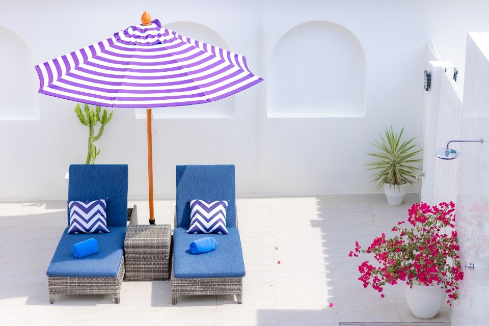This Studio apartment is right by one of the island's most spectacular and longest sandy Beaches. The iconic, relaxed Shambhala beach bar infinity beach front pool and the spectacular bay with its islands can all be seen from the terrace. The studio is very spacious with 69 square meters of area and a large balcony facing the ocean with sea breezes & sunsets. It sleeps 2 Adults. Breakfast is included.