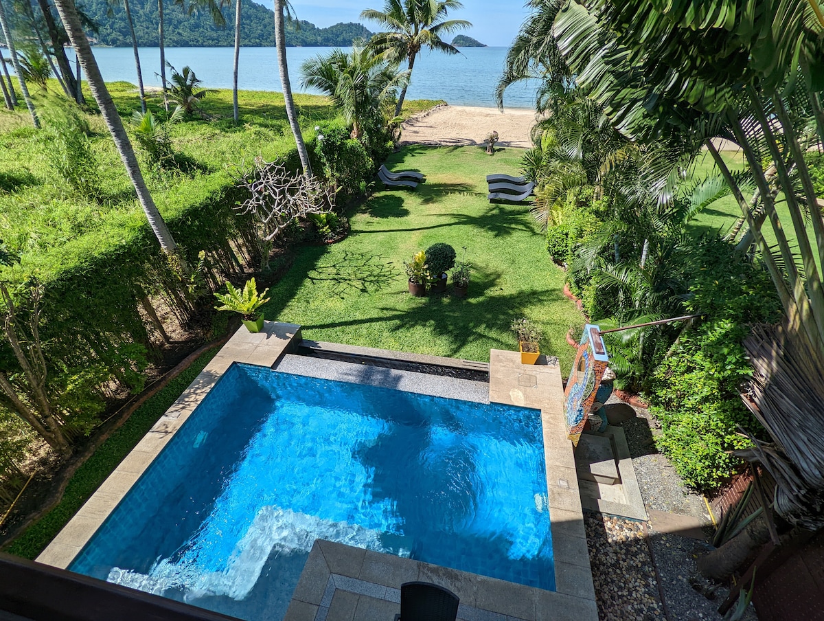Beachfront house in Siam Royal View, Koh Chang! This beautiful house has direct access to the beach, private pool and features 4 bedrooms with 3 bathrooms. You can enjoy the stunning views of the ocean from the comfort of your own home. The house is near a family-friendly beach club with 2 restaurants. Enjoy delicious meals while enjoying the beautiful scenery. This house is perfect for those who want to relax and enjoy the beauty of nature. Perfect place to spend time with family&friends