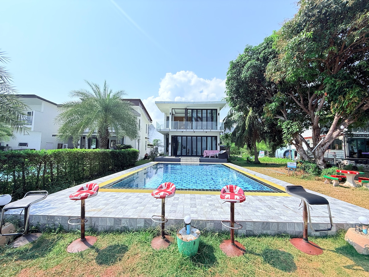 Beachfront house in Siam Royal View, Koh Chang! This beautiful house has direct access to the beach, private pool and features 4 bedrooms with 3 bathrooms. You can enjoy the stunning views of the ocean from the comfort of your own home. The house is near a family-friendly beach club with 2 restaurants. Enjoy delicious meals while enjoying the beautiful scenery. This house is perfect for those who want to relax and enjoy the beauty of nature. Perfect place to spend time with family&friends