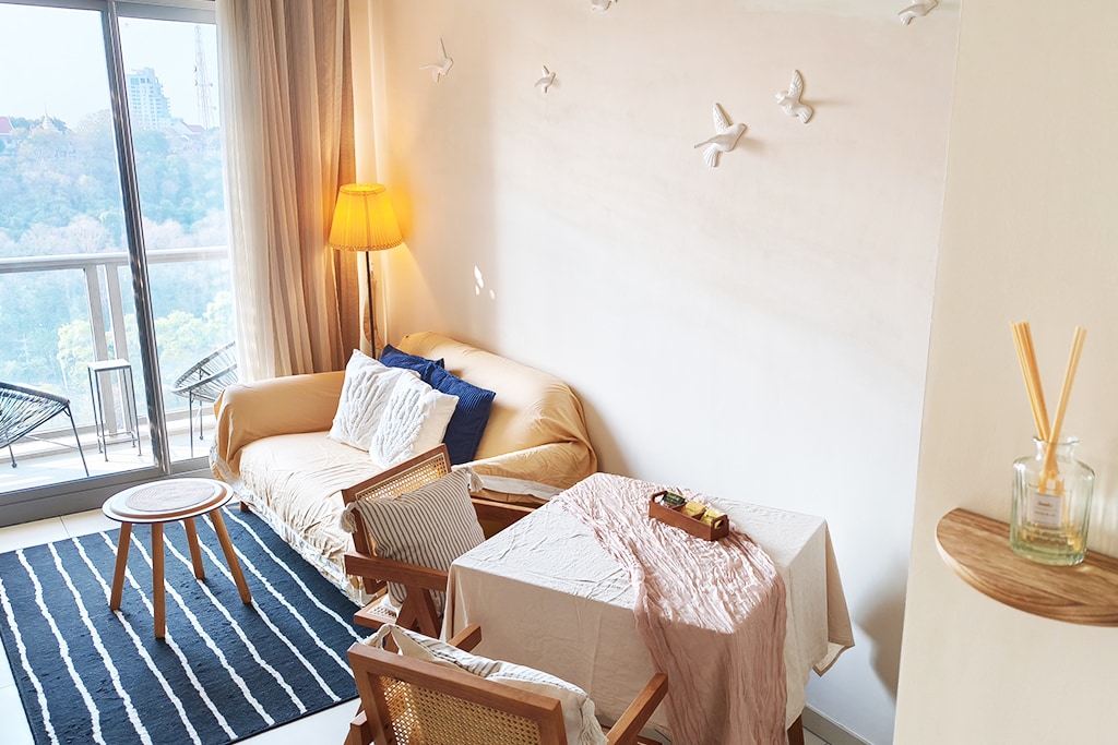 Chic 1BR w/ Sunset Sea View | Minibar & New Year Treat Cozy 1BR (35 sq.m.) on the 31st floor with daily sunset views over Jomtien Beach. Lounge on comfy balcony chairs and enjoy sea breezes. Bright lemon sofa pops against flying ceramic seagulls. Open-plan living, dining & kitchen with airy layout. Bedroom features oak tones, rope pendant lamps & watercolor whales. 🎁 Includes minibar + sparkling set for New Year stays!
