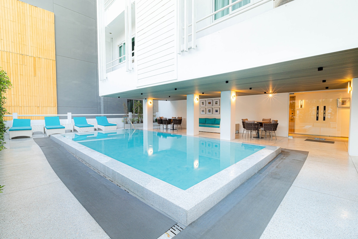 套房,靠近步行街和沙滩,户外泳池,距离夜市300米,门口24小时711超市和货币兑换,有摩托车出租.