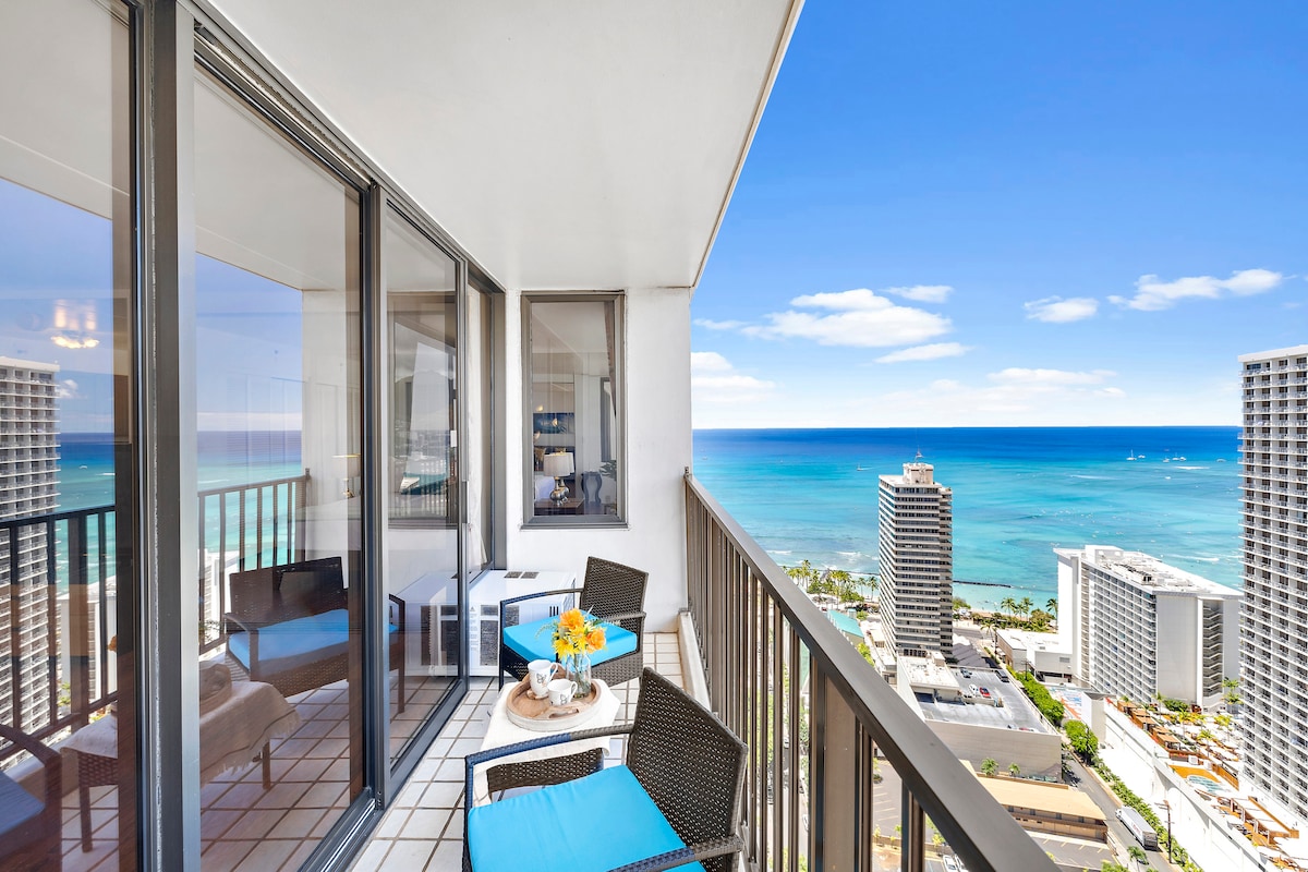Modern paradise in this beautifully upgraded, high-floor luxury condo boasting spectacular ocean and sunset views. Short 900-foot stroll to Waikiki Beach, enjoy easy access to Honolulu's best attractions. Features complimentary high-speed fiber internet and WiFi, 50" smart TV with 175 channels, and a fully equipped kitchen for your convenience. Free parking for one vehicle in the attached ramp. 6th-floor recreation deck. 3 queen-size beds, comfortably accommodates up to four adults.