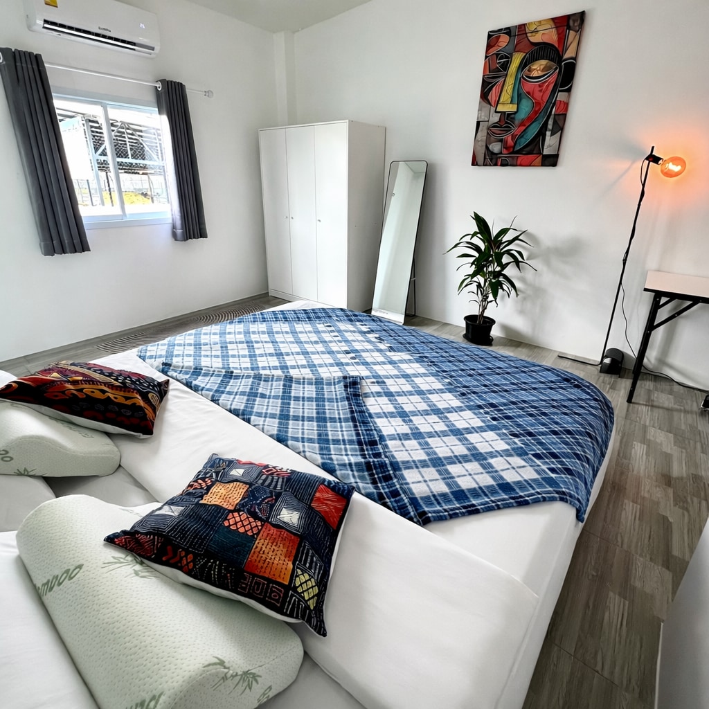 Enjoy magical sunsets from your private balcony in this bright and stylish 2-bedroom apartment just 30m from the beach. Located on the top floor of a modern house with a private entrance and full privacy. Surrounded by tropical calm, you’re perfectly placed between Thong Sala and Haad Rin — close to cafés, yoga, the night market, and the energy of the Full Moon. Wake up to birdsong, fall asleep to the sound of waves.