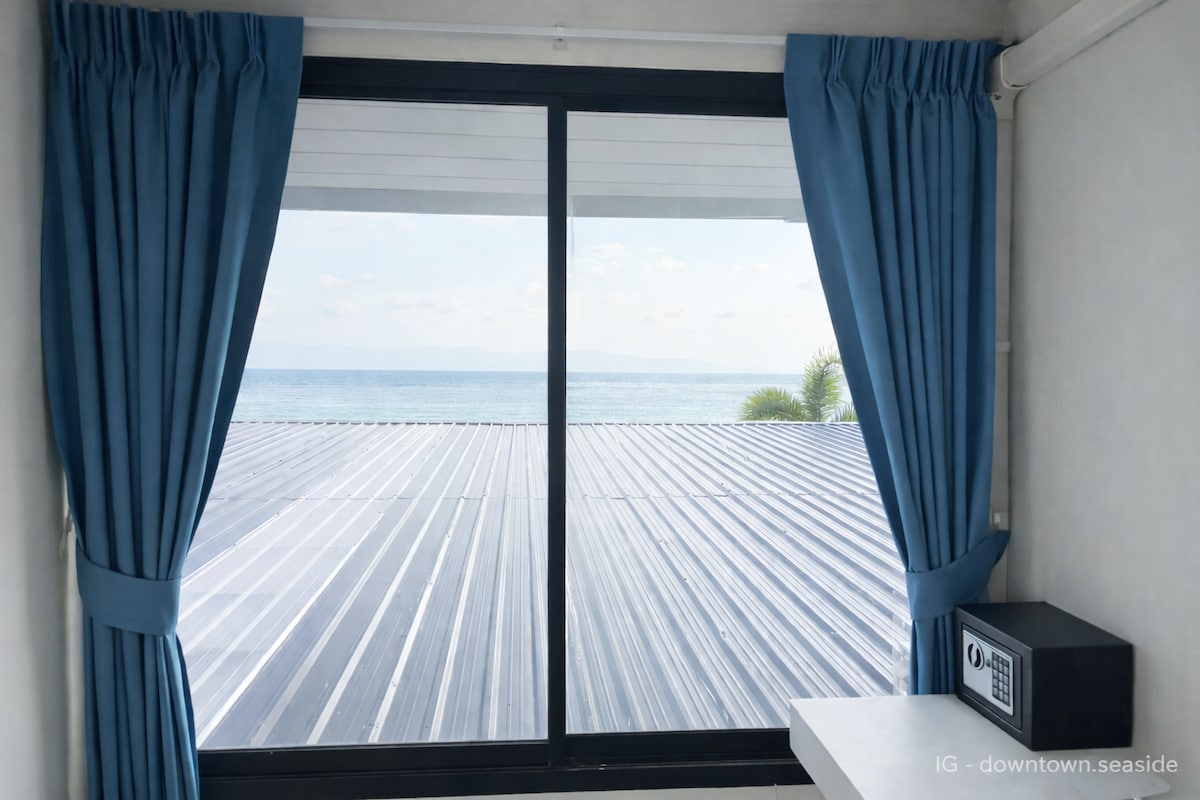 Just 30M(1 min walk)from the beach, New 110 sqm sea view suite with sunset view. 3 A/C including 2 A/C big space Bedrooms with king size bed in each room and a wardrobe in each room + 1 shower + toilets and A/C living room including a table & couches, fully equipped kitchen including table + 4 chairs. a huge 36m balcony with electric plugs table and chairs+mattress+pillows facing the colorful sunset and the golf of Thailand.one min walk to pool and restaurant. parking space for car/motorcycles
