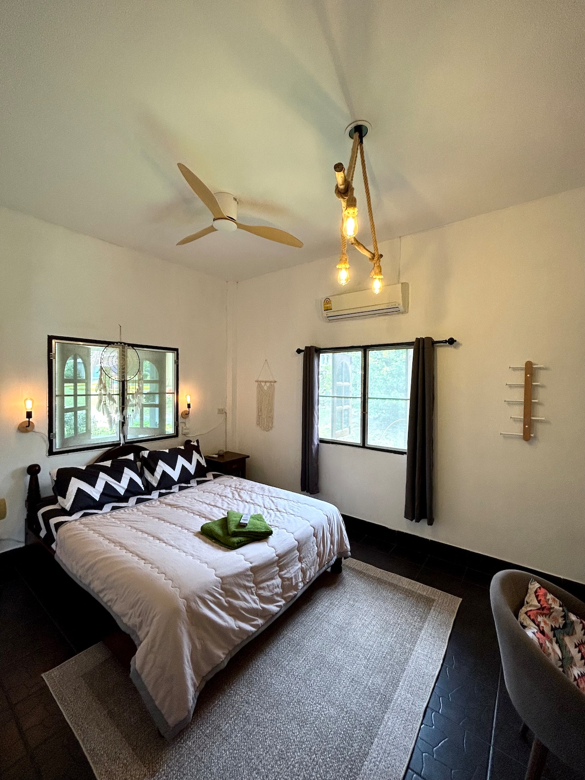 Suan Residence is the right place for nature-loving people who want to relax. The beach & city center are at waling distance (~7 minutes). Each bungalow is private so you can get quality time with the one you love. You will wake up with the birds singing and take your morning coffee surrounded by mountains and coconut trees. During the evening, you can watch stunning sunsets from your swimming pool. It is an eco-friendly project. We decided no to put AC but insulation instead to reduce the heat.