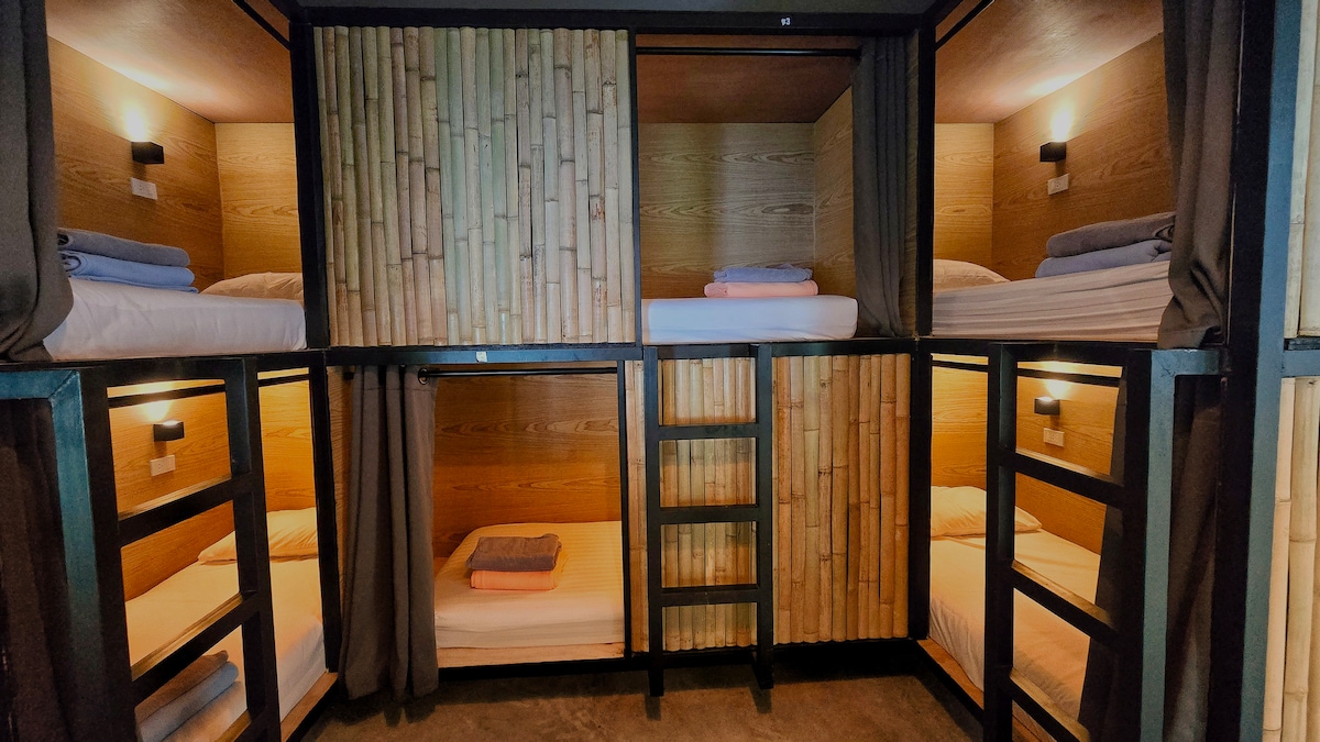 Stay in our brand-new Buddha View Hostel in Mae Haad! Deluxe capsule beds with curtains and reading lights, modern shared bathroom, air-conditioning, and a large balcony with sunset view. Access to common area & working zone. Reception 8 AM–8 PM with QR code for direct WA support. 300 m from the pier and close to shops & diving activities with Buddha View Dive Centre.