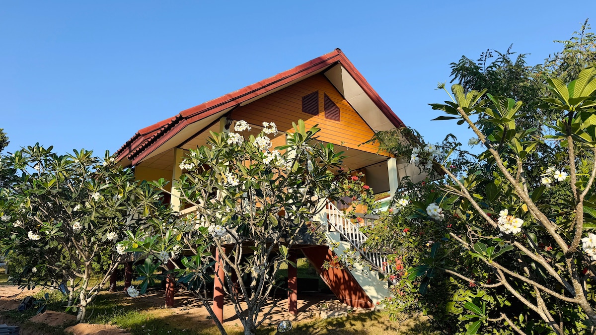 Authentic Thai wooden house on Coconut Lane In heart Srithanu, recently renovated. Private area with a lush garden and century-old trees. A lotus pond with fish lies beneath the house. Equipped with AC, kitchen, Thai-style bathroom, balcony and chill-out space with barbecue. Pet-friendly. A unique spot in Srithanu with abundant greenery and the shade of an old tropical garden. Please note: As a traditional wooden Thai house, it offers a rustic experience with some natural imperfections 😌🙏🏼