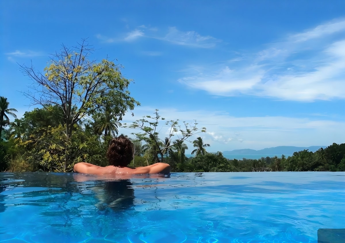 Luxury Seaview Villa with Salt Pool & Sauna Welcome to your modern tropical retreat in Koh Phangan! This stunning 4-bedroom villa blends warm minimalism with Thai touches, offering a perfect mix of comfort, style, and breathtaking ocean views over Srithanu Beach, just 1km away. Nestled in nature 200m from the main road connecting Chaloklum to Thong Sala, the villa provides both privacy and easy access to the island’s best spots, including Hin Kong Beach (5 minutes away).