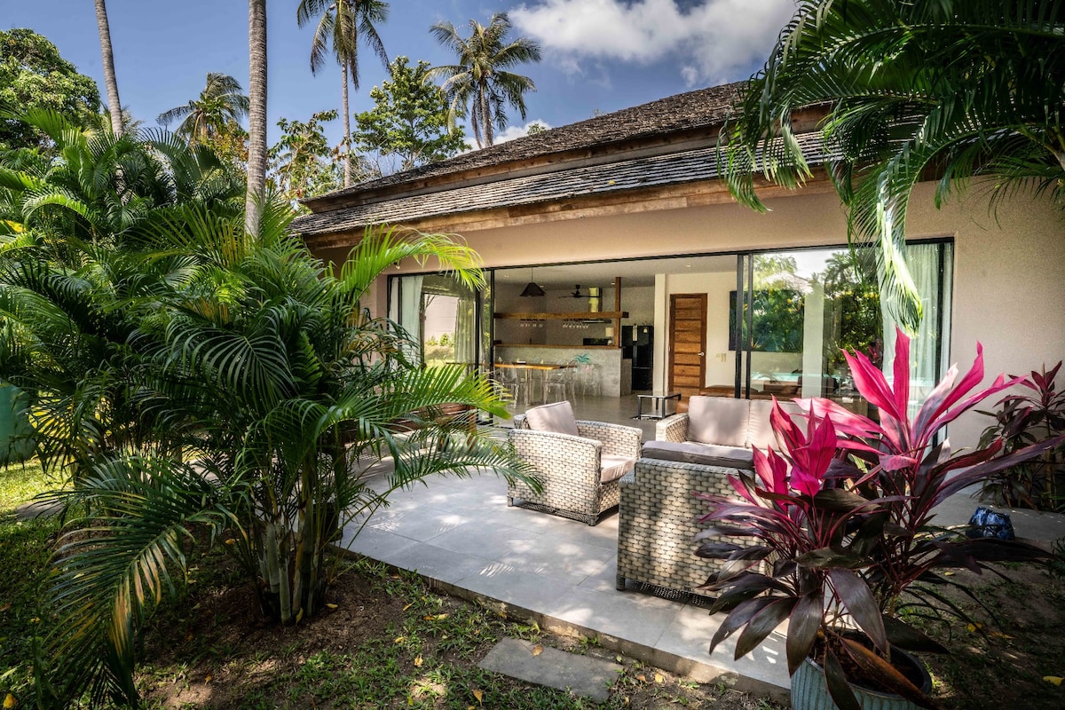 Perfect for groups & families, this luxurious 5-bedroom villa offers total privacy, tropical design, and everything you need to unwind or celebrate. Enjoy your own private pool, full gym, and steam room on an expansive garden estate. Sleeps up to 12 with indoor-outdoor living, high ceilings, and fully equipped kitchen. A rare island gem for families, friends, or wellness getaways.