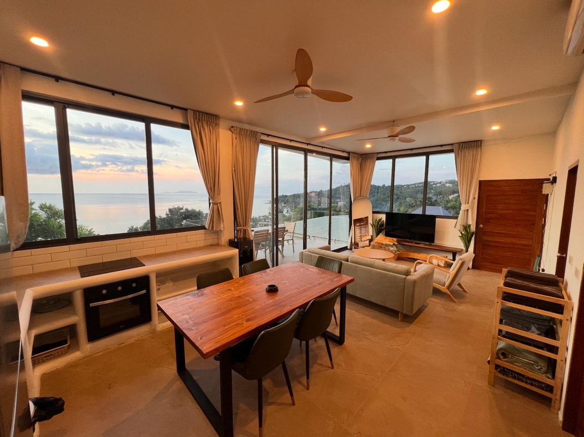 Located 30 meters (1 minutes walk) from the beautiful & calm Baan Kai beach. a Luxurious new sea-view apartment with 2 A/C Master Bedrooms with comfortable king size bed in each bedroom, a wardrobe and a bathroom attached to each bedroom. A/C Living Room including a table & sofa, TV ,WiFi and ceiling fan. fully equipped kitchen and dining space including table+6 chairs+outdoor table+4 chairs on the spacious balcony facing the amazing panoramic sunset views of Koh Samui and the golf of Thailand.